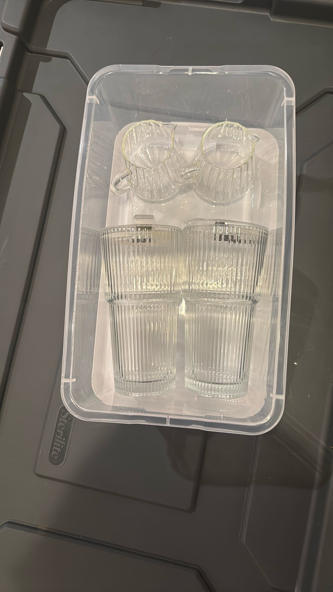 2 glass ribbed tumblers and 2 espresso mugs for sale. Straws not included.