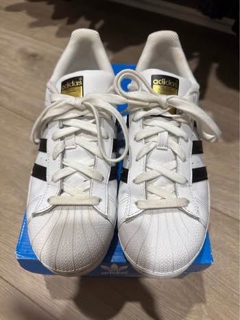 Authentic Adidas Superstar W sneakers in classic white with black stripes. Timeless shell-toe style that goes with everything. Details: • Women’s Size 8 (UK 6.5 / EU 40) • Style: Superstar W • Style Code: C77153 • Colorway: White / Black • Leather upper with rubber shell toe • Adidas Originals line • Includes original Adidas box Condition: Good pre-owned condition. Light wear on soles and minimal creasing on uppers (see photos). Clean interior and laces. Perfect everyday sneaker for casual outfits