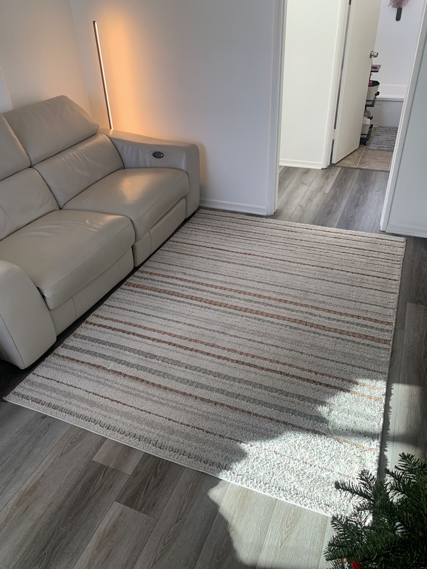 Beautiful, modern area carpet in the soft neutral palette. Cream base with subtle horizontal stripes in warm tan, cinnamon and light gray. Easy to match with most interior. Softly cuddles your feet, ads warm and texture without our powering the space 5’ 3“ x 7‘ Cream with earth tone stripes. modern minimal cozy Condition very very good, clean and cared for. Great for living room, bedroom office or under a coffee table. Smoke free, pet free home. Ready to use
