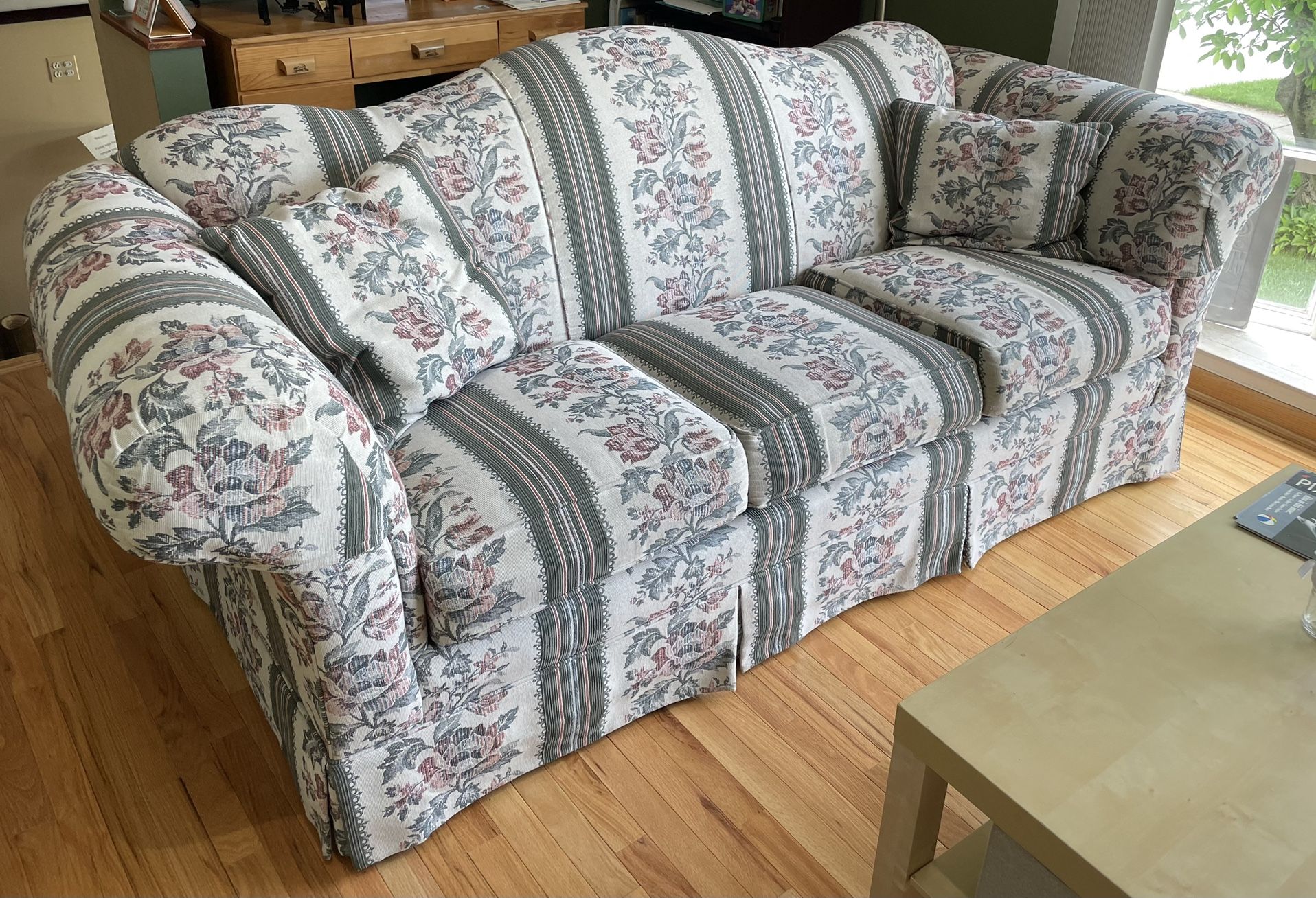 91”Lx37”D Arm Height: 32”, Back Height: 37”. Complete with matching throw pillows.