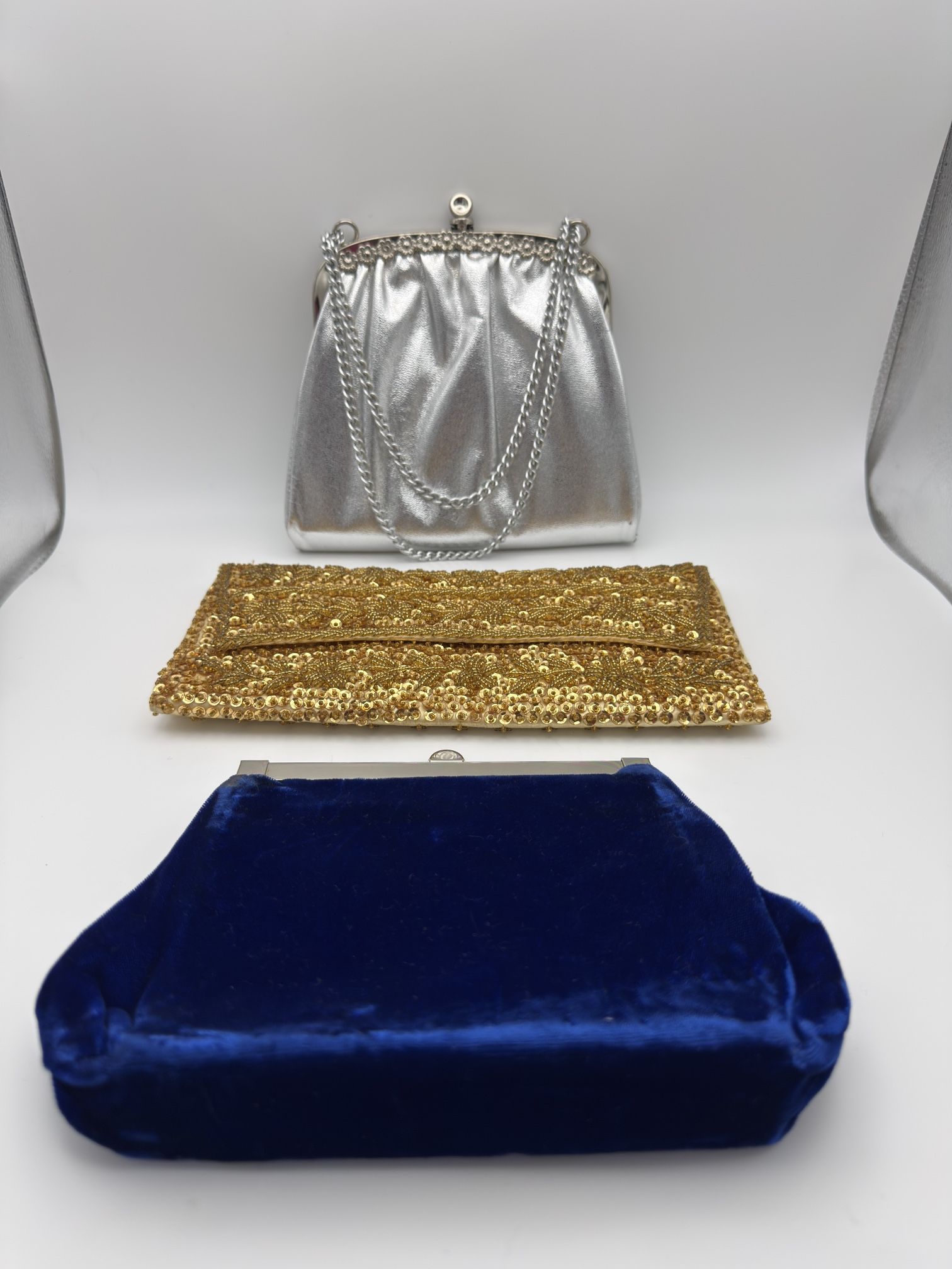 Beautiful lot of three vintage evening handbags. Includes silver frame purse with chain strap, gold beaded clutch, and royal blue velvet clutch with metal frame. Perfect for weddings, parties, formal events, photoshoots, or vintage collectors. Condition: pre-owned vintage condition. Light signs of wear inside and on metal frames consistent with age. All clasps work properly. Sold as a set of 3.