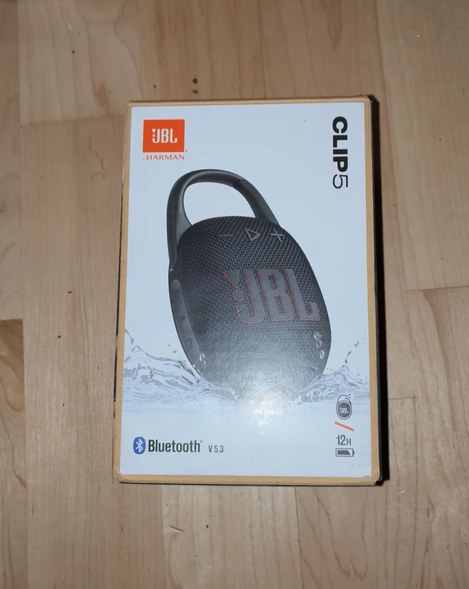 ***$40 CASH ONLY NO TRADES*** (Never Opened Sealed) The JBL Clip 5 is a small, rugged, ultra-portable Bluetooth speaker known for its integrated carabiner for clipping onto bags or belts, delivering surprisingly big JBL Pro Sound with punchy bass for its size, and boasting an IP67 waterproof/dustproof rating for outdoor adventures, offering up to 12 hours of playtime with customizable sound via the JBL Portable app.