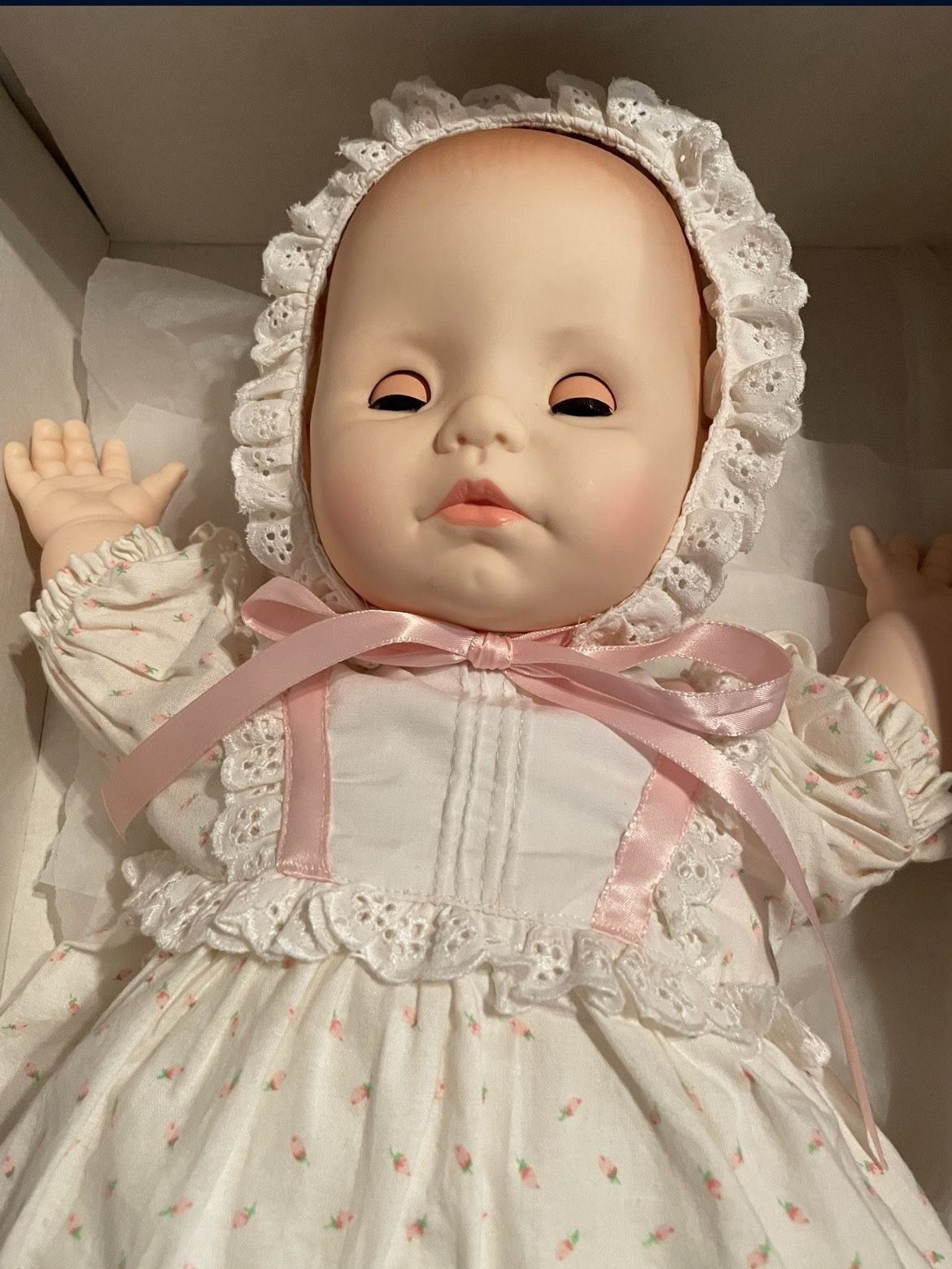 Rare - 1988 Effanbee Baby to Love 19” doll. Style No. 4958. Composition and cloth doll in original Effanbee outfit including bonnet, booties, and underpants. Beautiful lashed eyes open when you lift her. New, in original box. Great Christmas gift! Rare, difficult to find a new Effanbee .
