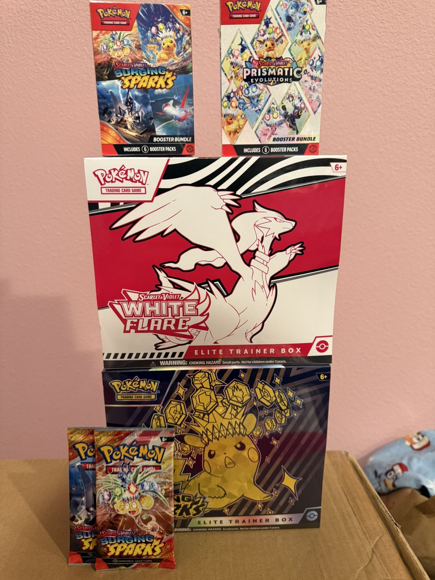 Surging sparks ETB white flare ETB mega evo ETB not currently pictured prismatic bundle x2 Surging sparks bundle 1 booster pack Surging sparks
