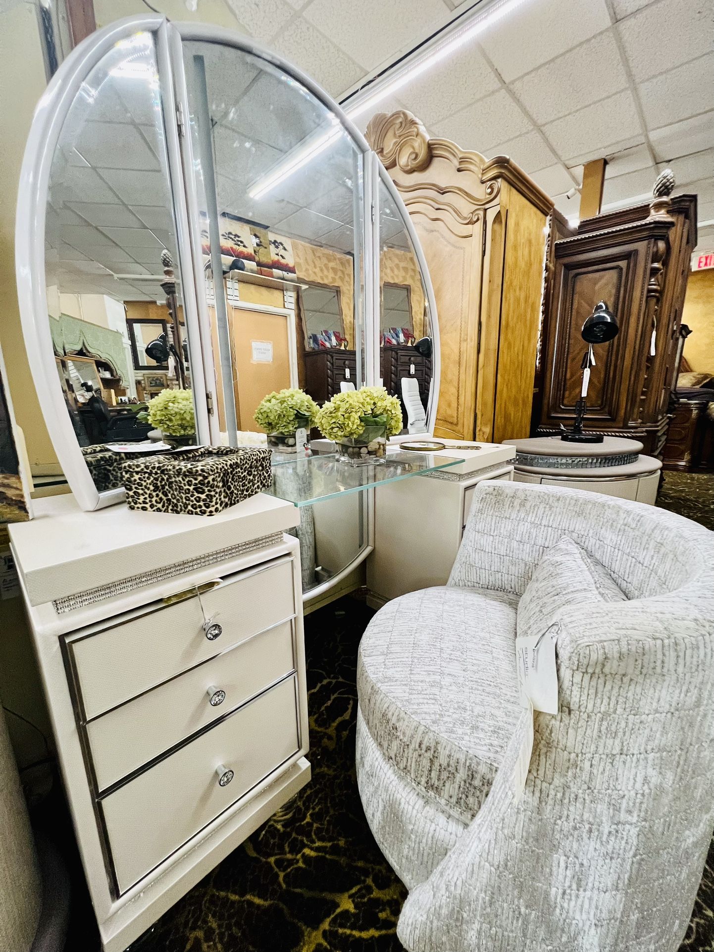 WE HAVE A LARGE INVENTORY IN HIGHEND FURNITURE, WOOD FURNITURE WITH ALL DIFFERENT COLLECTIONS. DINING ROOM SETS, BEDROOM SETS, LIVING ROOM SETS AND MANY OTHER BRANDS LIKE MAITLAND SMITH, VERSACE, BERNHARDT, HENREDON, BENNETTI AND ALSO ITEMS TO COMPLEMENT YOUR HOME DECOR, ACCESSORIES, PERFUM, JEWELRY, CHANDELIERS AND MORE. WE SHIP TO YOUR LOCATION!!! ASK FOR A VIDEO CALL WITH US!!! Glimmering Heights is made with the shine of Hollywood's timeless luster. Finished with brilliant crystal, rich vinyl and ivory tones, this collection brings a glamour into your home that rivals every luxury look. Drawer fronts have metal edge trim for added visual appeal. Band of crystallized facets wrap around the front of the vanity. Drawers features soft closing glides and are velvet lined. Decorative front feet are sturdy acrylic. Low distortion beveled mirror glass with backlit LED lighting. AICO Furniture designed by Michael Amini has been a TOP name brand since 1988 AICO, which stands for Amini Innovation Corp, features original furniture designs and is known for high quality and intricately designed home furnishing case goods and upholstery. They offer many collections that suit various tastes and styles. Ask for our FINANCE LAYAWAY program!!! 🦊 Additional we have Available FINANCING with Klarna, PayPal, ACIMA And more!!! Available at: Snooty Fox Consignments 840 E Oakland Park Blvd Oakland Park, FL 33334 754.206.20.77