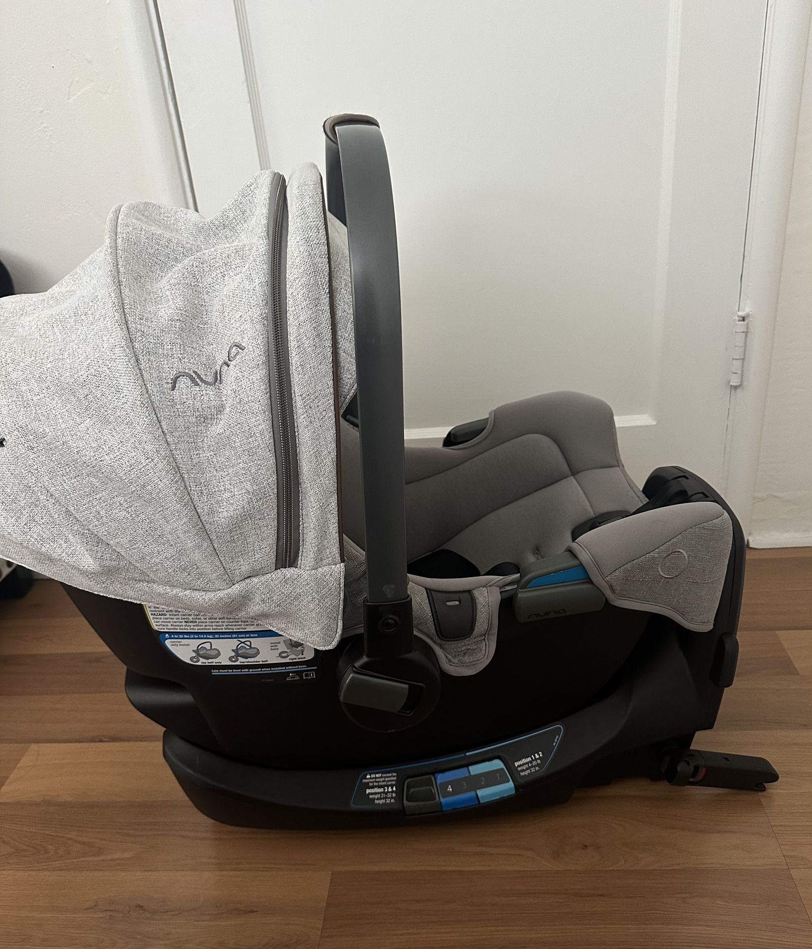 Nuna infant car seat with car base, stroller adapter and extra car base.