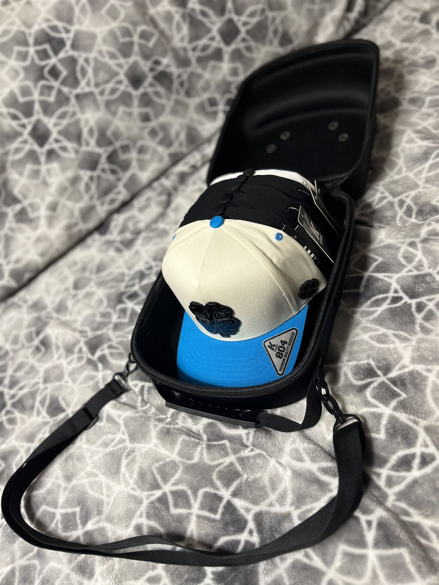 Nice carry on case that fits 5 hats. Snapback hats not included with case. Only used for reference. Snapbacks sold separately. ——— Caja para guardar cachuchas. Le caben 5. La caja no incluye las cachuchas.
