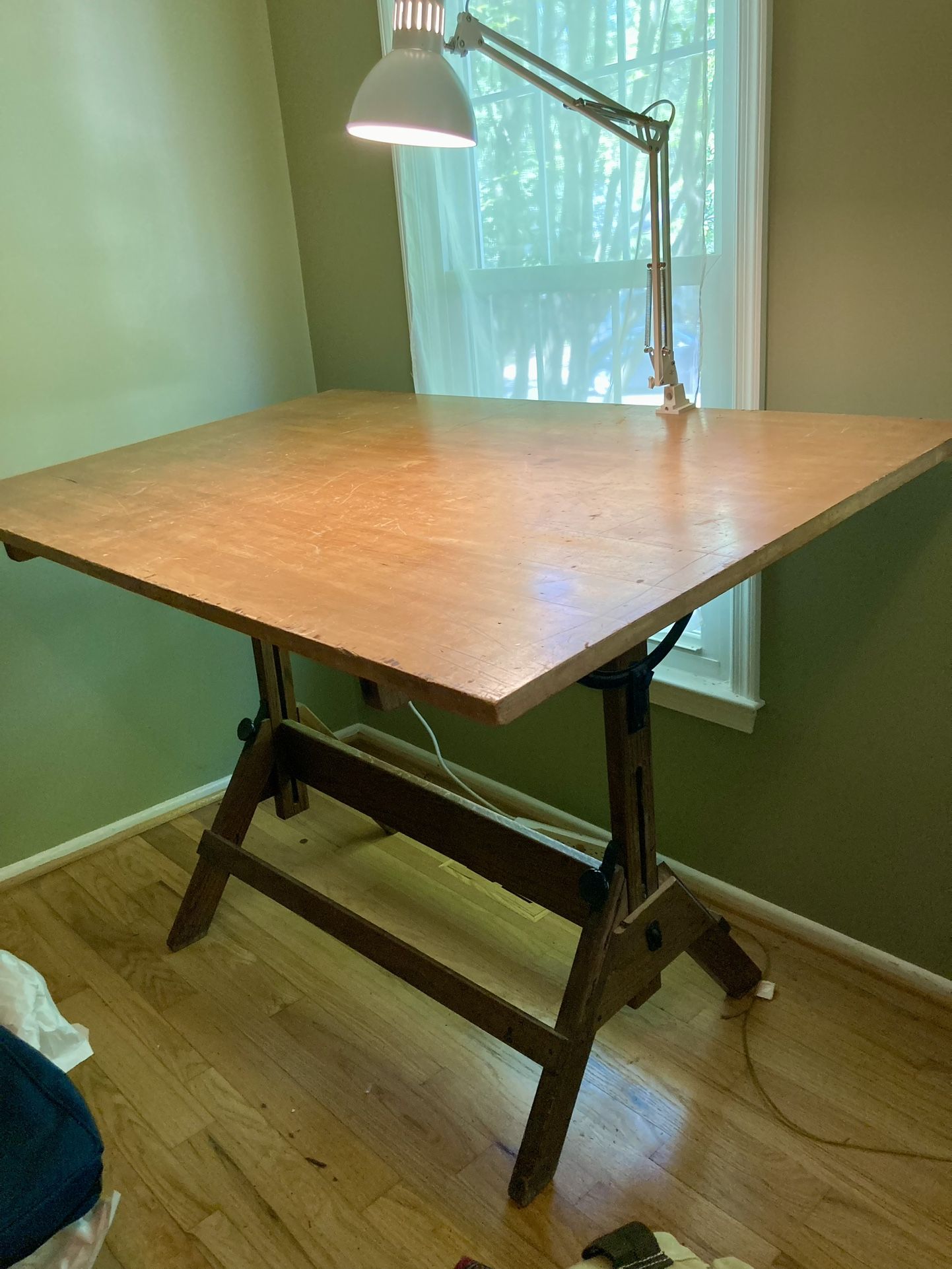 Classic lovely solid wood drafting table. 60” wide x 37.5” deep x 39” high, adjustable height. Table only, lamp not included. Enjoy! Pick up in Rockville, MD