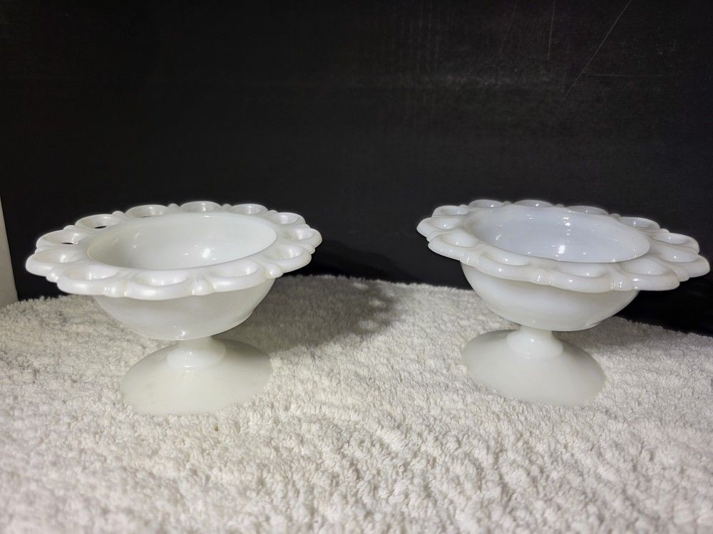 Vintage Anchor Hocking Old Colony Lace Edge Milk Glass Pedestal Candy Dishes 5" Set of 2 Great Condition