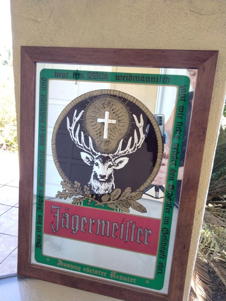 Beautiful antique jagermeister mirror, first time jagermeister was sold in Miami Florida 1985, 22 in Long - 16 in wide, 9lbs - beautiful condition. RARE mirror. JAGERMEISTER MIRROR!