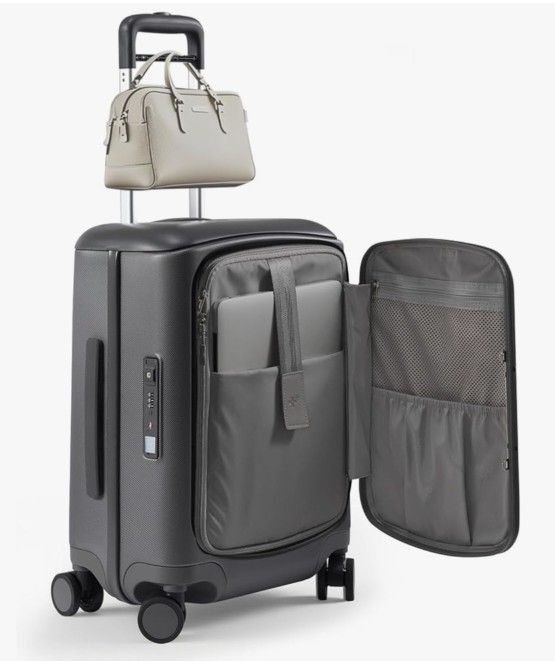 MULTICARRY Hang Safe Carry On Luggage, Rolling Suitcase with Spinner Wheels,Bussiness Hard Shell Luggage with TSA Lock&USB Port for Travel, Zipperless, Lightweight, Grey. Overall dimensions 22 in x 14.74 in x 9 in (Including spinner wheels and handle). Currently $229.99 on Amazon.