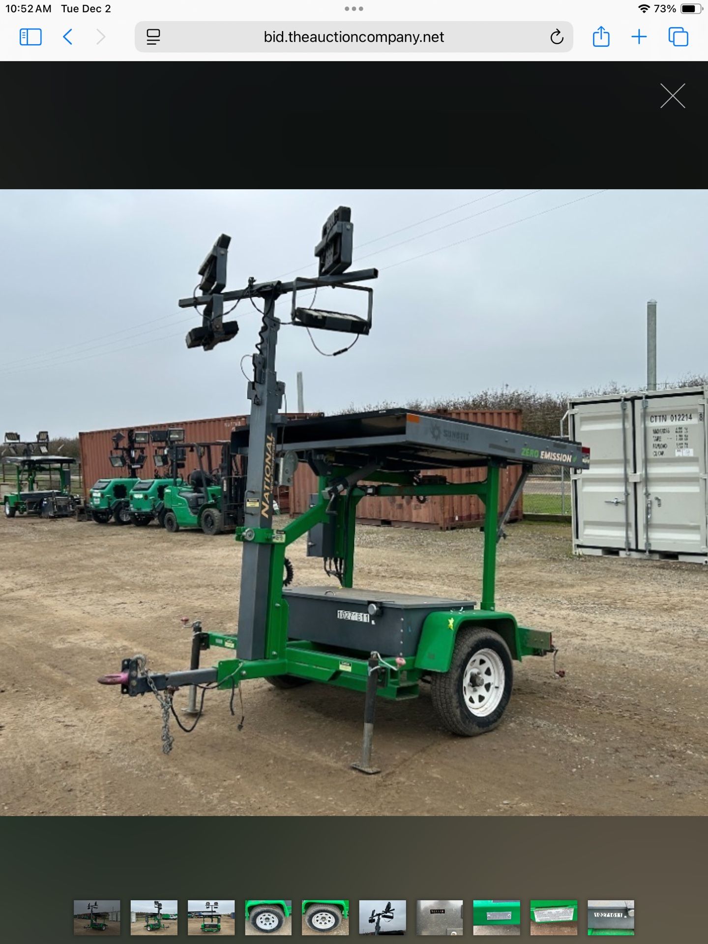 2019 NATIONAL SIGNAL LTS-160-750 LIGHT TOWER, SOLAR, PORTABLE. S/N:1N9LX1016KF272513 --(LOCATED IN MADERA, CA)-- (Madera, CA) The Auction Company - DECEMBER AUCTION! Auction Catalogs: https://bid.theauctioncompany.net/auctions AUCTION INSPECTION * Friday & Saturday, December 12th & 13th, Equipment Inspection: 8:30AM – 4:00PM. (Register online now!) * Monday, December 15th, Online-Only Auction Begins Closing its first lot at 10:00AM. Location: 19458 Road 21. Madera, California 93637 Office #: (951) 657-5300 HOW TO REGISTER 1. Go to: www.theauctioncompany.net 2. Click “Register/Login to Bid”. 3. Click "Register Now" and follow the signup process. 4. $1,000 deposit required to bid (Placed on a hold). * if no bids are won the hold will drop. * If you win any bids, the deposit will drop after all items are paid for and picked up from the yard. * You only need to register once for all 3 auctions. Feel free to call if you need help registering IMPORTANT NOTES * All items are sold “AS IS” – descriptions are guides only. * Inspect equipment in person before bidding when possible. * You can start placing bids online at any time once you’ve made an account.
