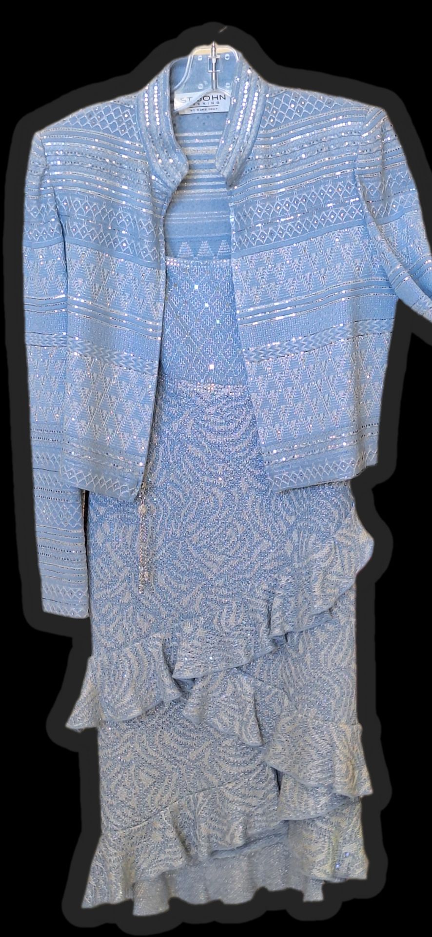 2 Pc St. John's knit blue size 6 Very classy set as St. John never goes out of style worn one time...mother of the bride...wedding dress...evening event...elegant go out on the town. Light blue....sequins on both pieces. This brand NEVER goes out of style...posted a size chart check size 6. Pretty blue.