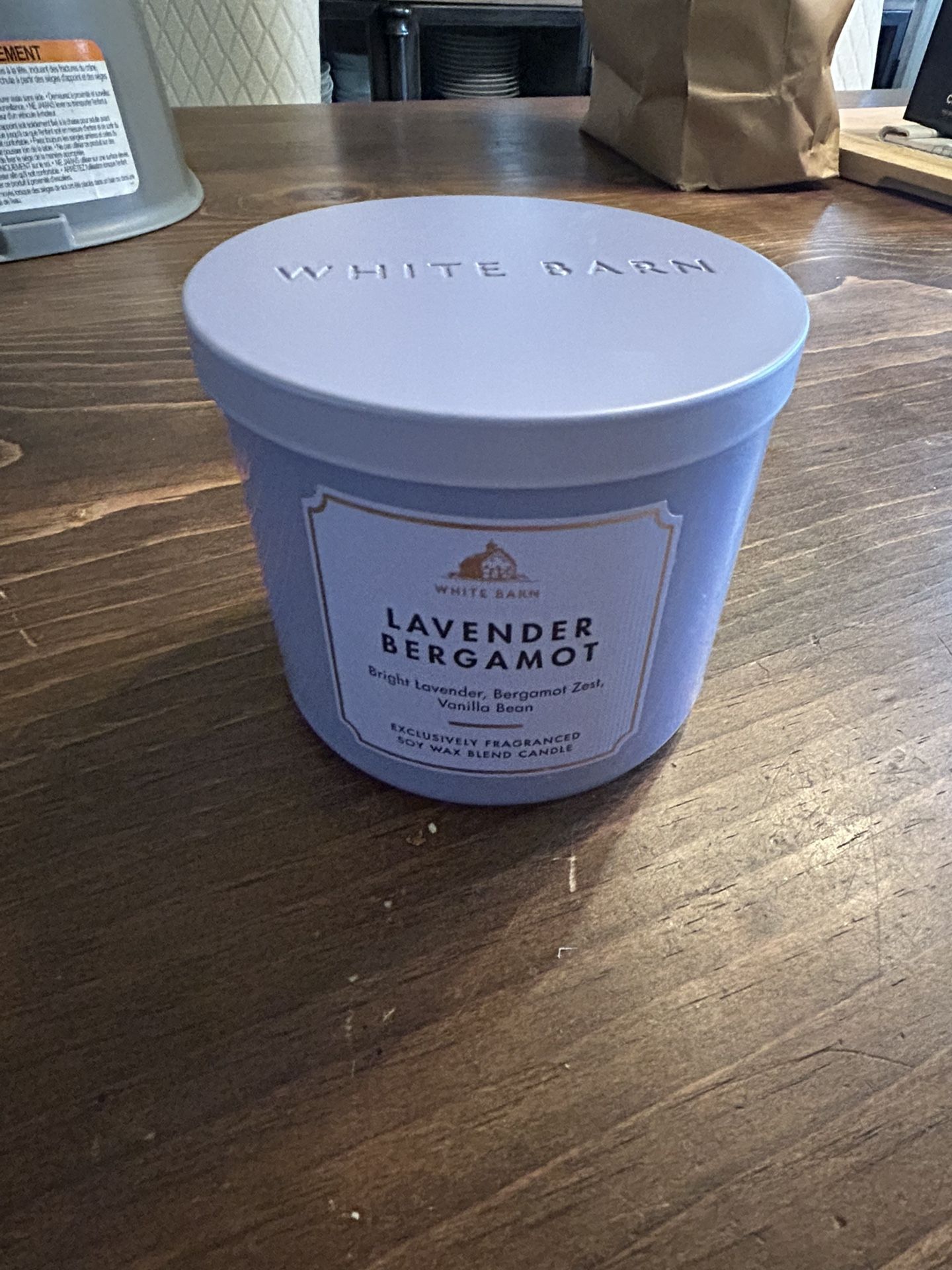 New and unused Bath & Body Works White Barn Lavender Bergamot 3-wick candle. Bright lavender, bergamot zest, and vanilla bean scent. Wicks are unburned and wax is smooth. Clean jar with original lid.