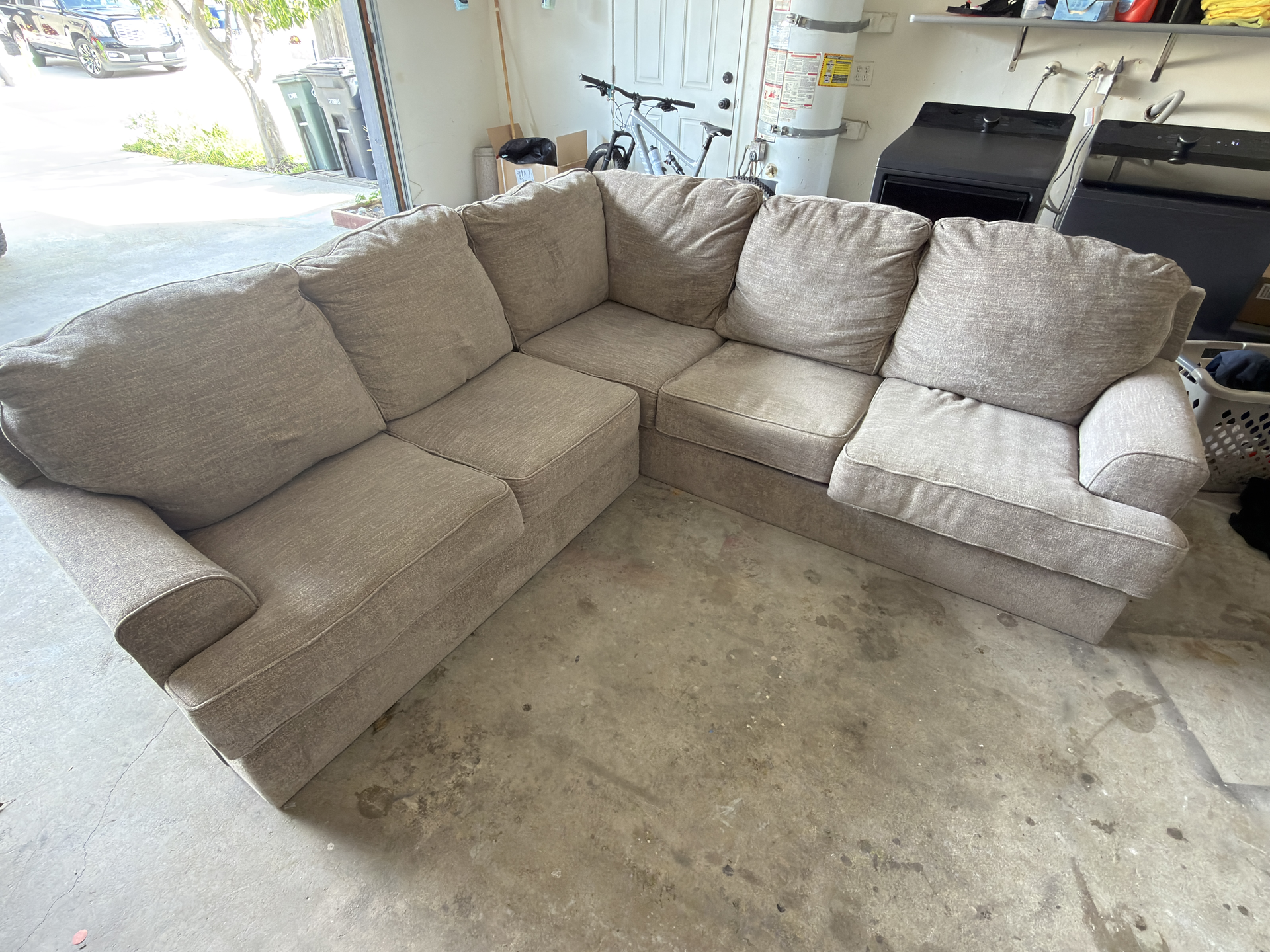 97.5. L x 39.5 W x 29.5 H Beige/Light Brown in color When connected each section length is 97.5L in each direction. Was purchased from Bobs Furniture few years ago but does not fit in my new home, my loss is your gain. I can help load, but local pick up only Well taken care but has one small hole but you cant see while couch is connected to sectional. $500 OBO