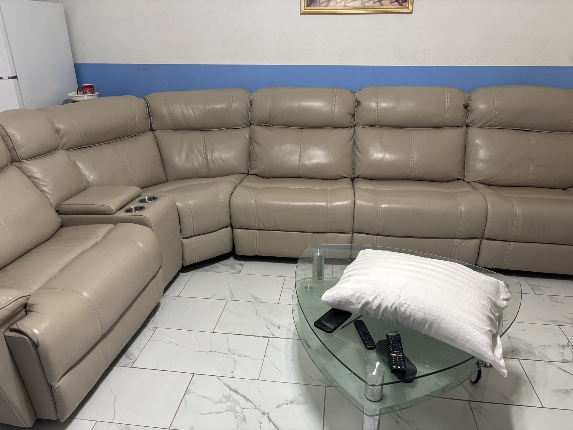 This sofa is made of real leather it has 3 reclining seats and a usb plug on each end of the sofa.