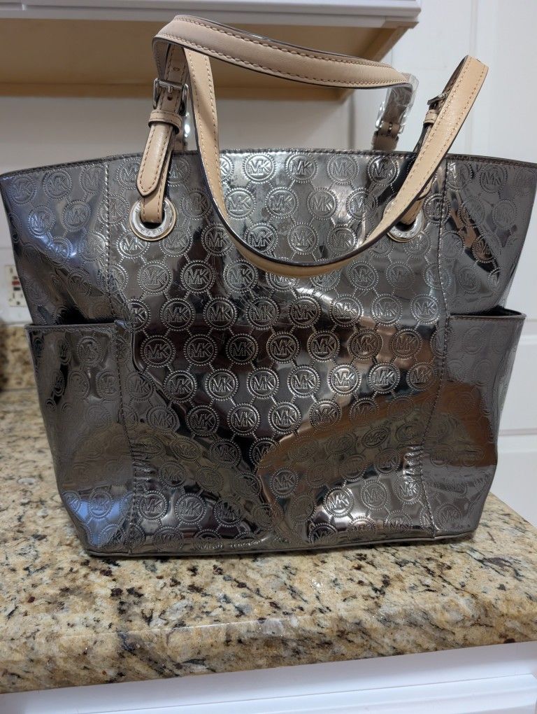 Stylish Michael Kors tote with a sleek metallic MK logo design and tan leather handles. Spacious interior—perfect for everyday use, work, or travel. Gently used and well cared for, clean inside and out.