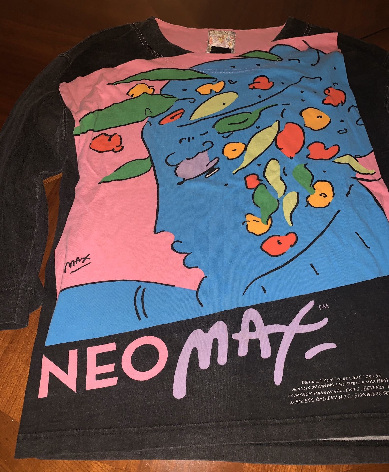 Collectors item. Vintage Peter Max half sleeve shirt. I LOVE this shirt & I always will but I don’t wear it enough and I don’t want it just sitting in my closet when someone else can enjoy it. The tag is faded so I can’t see the size anymore but I would say it’s a women’s small / medium.
