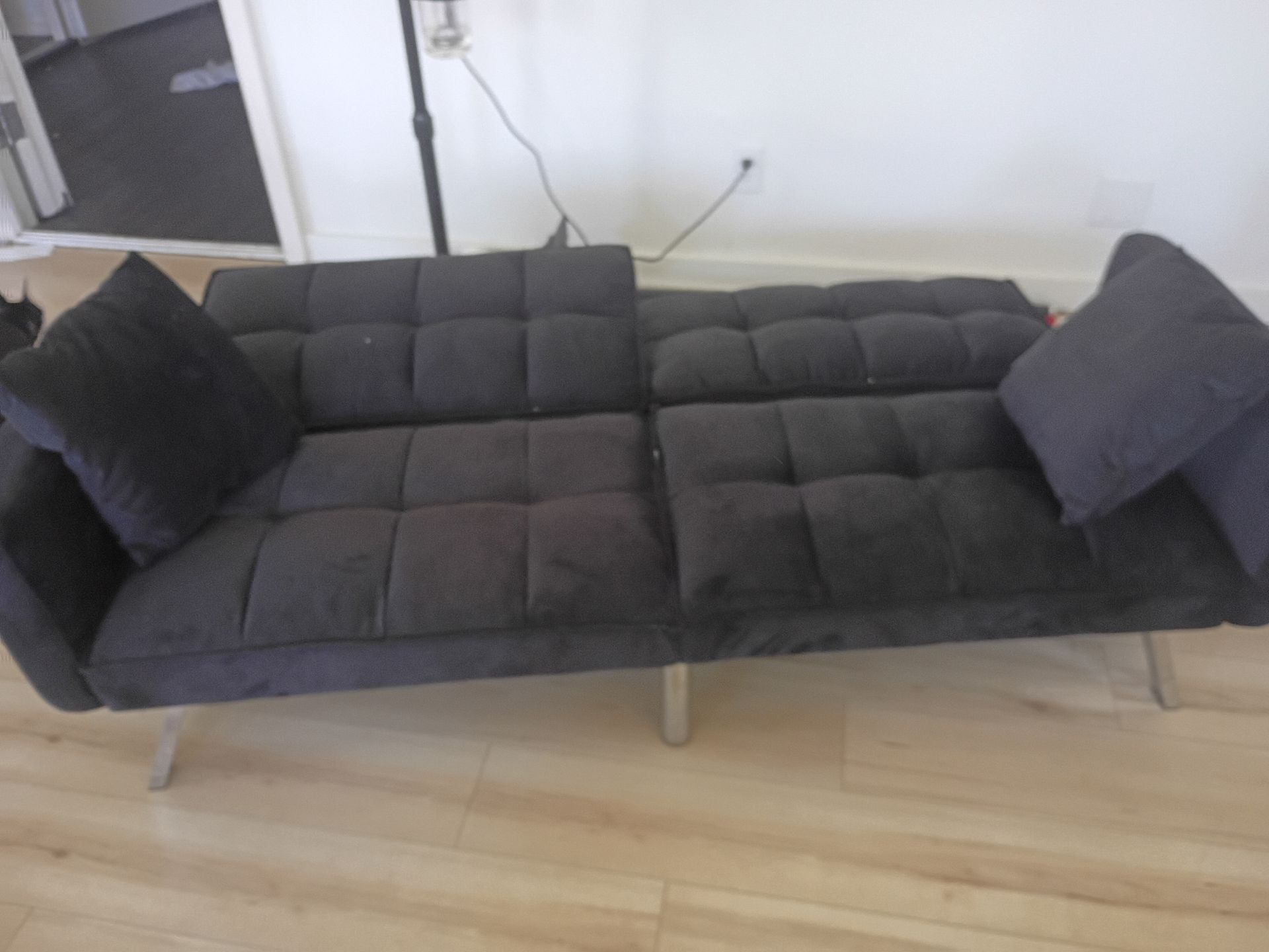 I have a truck and can drop it off today if anyone’s interested needs to be gone today assembled, never used. Super clean and in excellent condition. No stains, rips, or damage. Features: • Converts easily from couch to bed • Sleek modern design (black fabric) • Includes matching pillows • Sturdy metal legs • Perfect for living room, guest room, or small spaces I just put it together but ended up not needing it. Has not been slept on or used. Basically new. Dimensions (approx): Fits 2–3 people as a couch and folds flat into a bed. Pickup only. First come, first served. Optional add-on (to increase response rate): Originally paid $200+, asking $125 oBO.