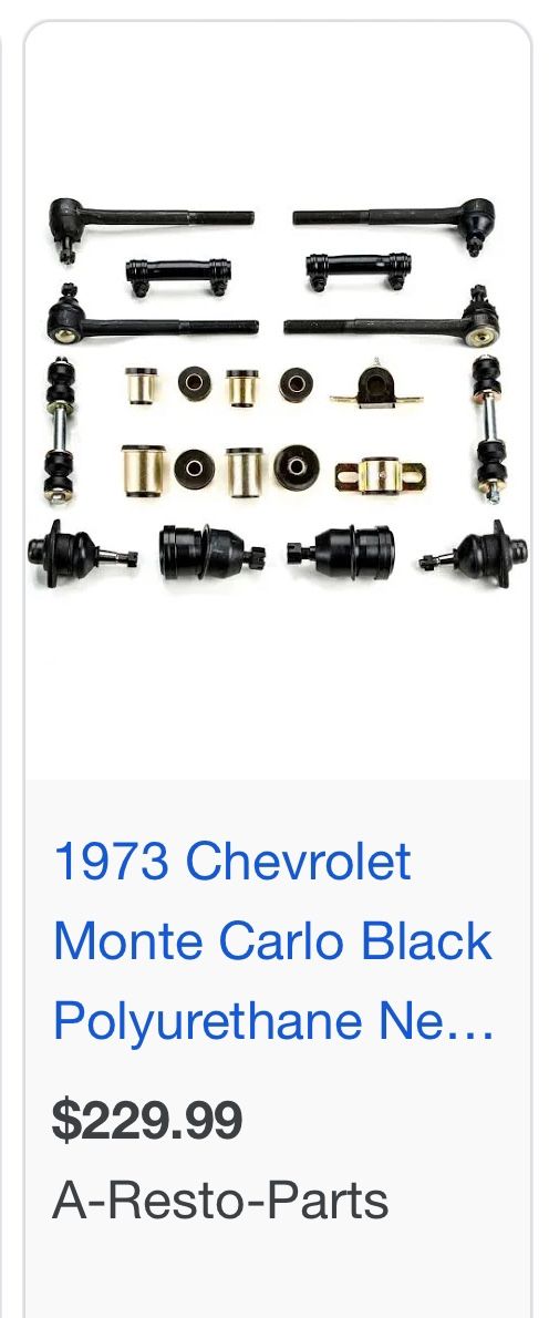 73-77 Monte Carlo suspension parts. I had purchased a complete kit bcuz it was cheaper than buying individually. Parts are still in the packaging. Pictures of kit for reference. Highlighted in red are the parts that were used & are not included. Priced to sell… $100
