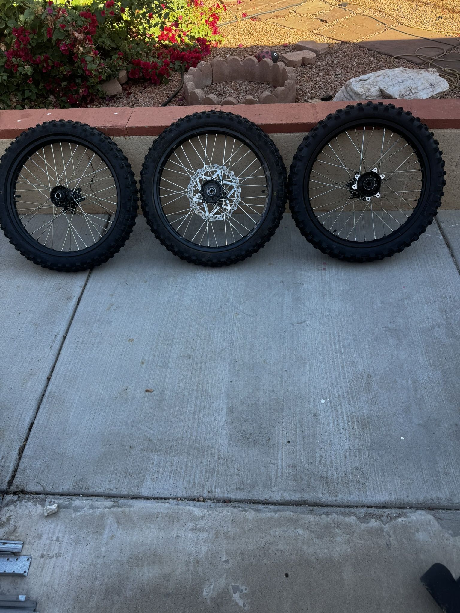 Extra set of wheels for Surron Ultra Bee. Upgraded my wheels so had these just laying around. Includes 2 front tires and 1 rear tire. Tire size 80/100-19 on one wheel.