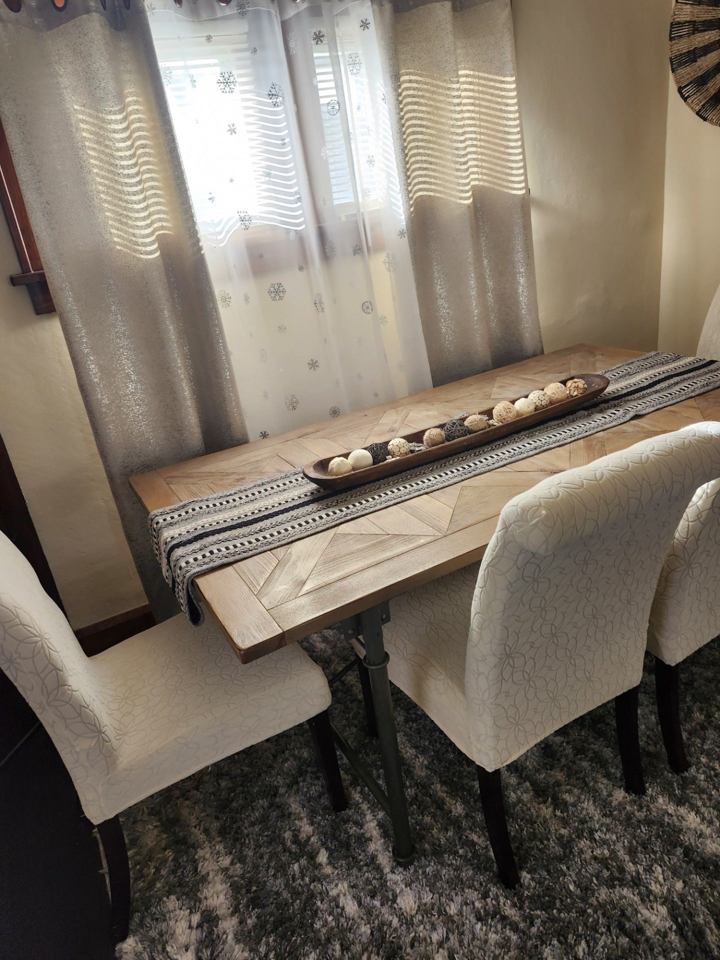 Dining table with 4 chairs. Chair covers included