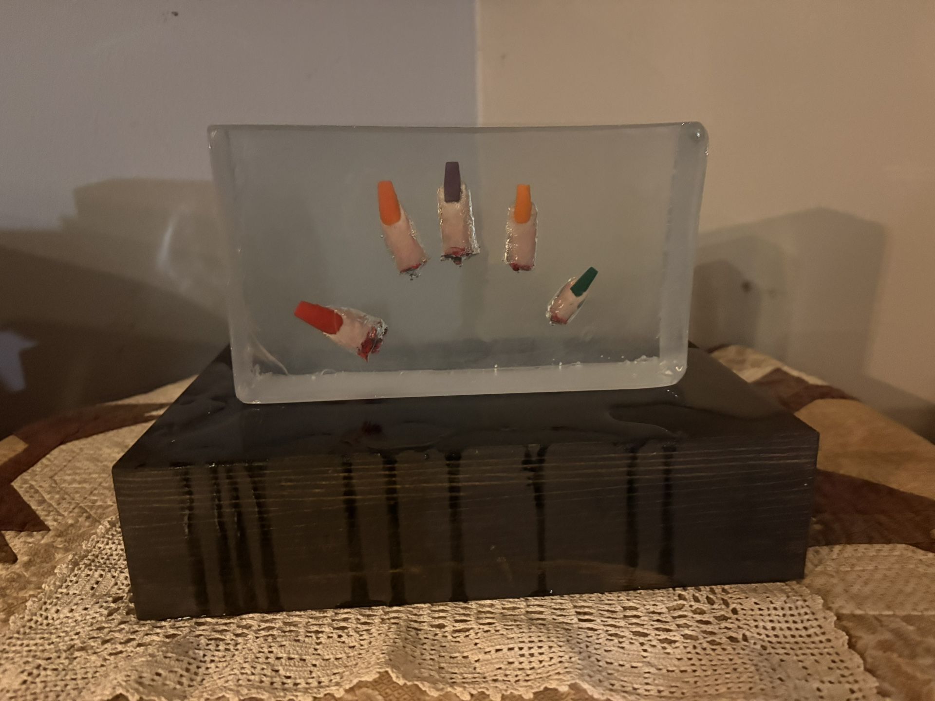 Made by hand my me, resin ice block with silicone encased fingers The base lights up