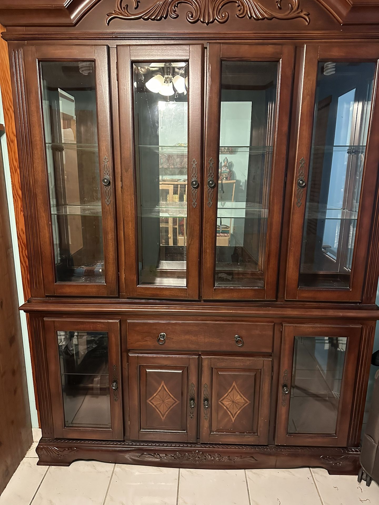 In solid Cherry wood this Buffet is a gorgeous piece of furniture. Sturdy glass panels with a velvet covered drawer - Two side drawers with glass panels and an inside cabinet. Overall in excellent condition. Original price $3,000. Selling at a very low price for this piece of work.