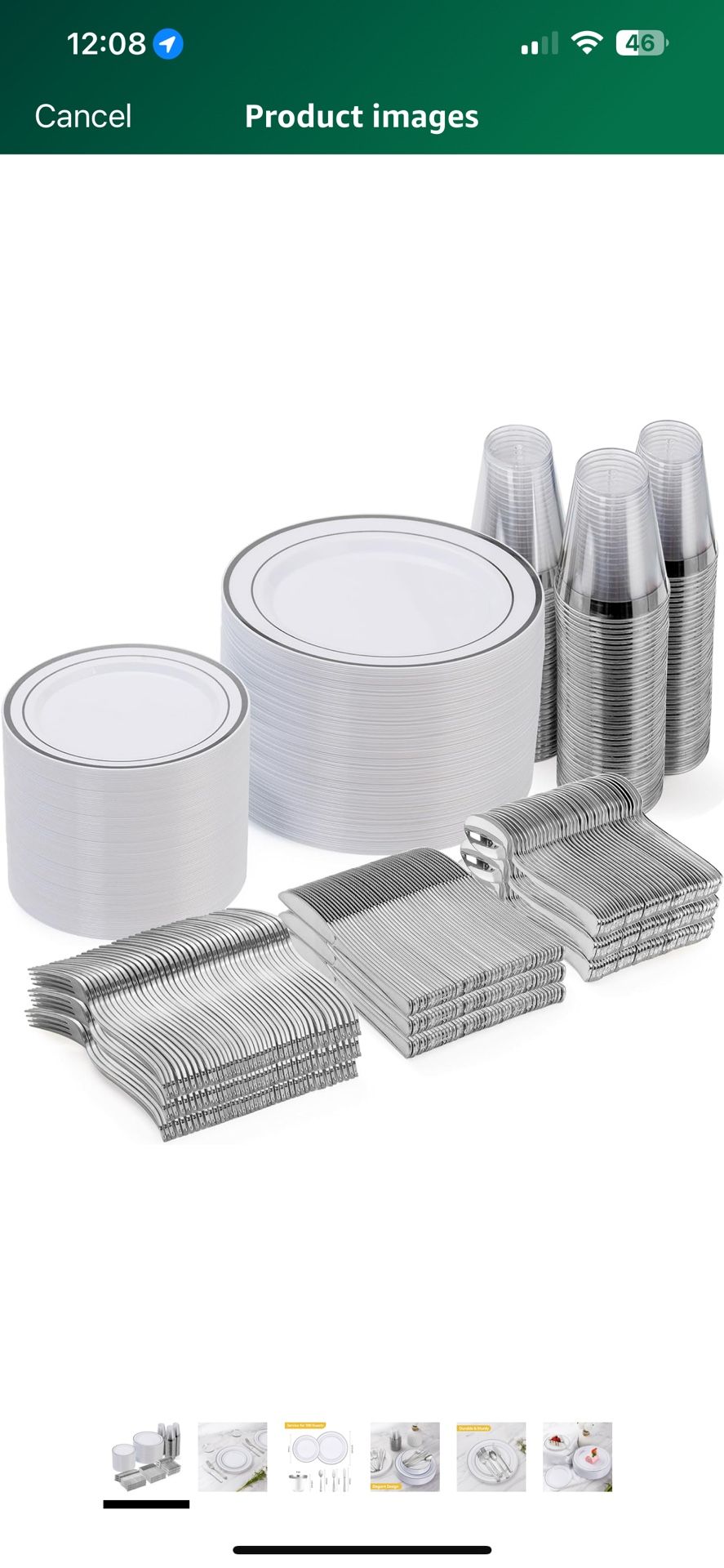600 Piece Disposable Silver Plates for 100 Guests, Plastic Dinnerware Set of 100 Dinner Plates, 100 Salad Plates, 100 Spoons, 100 Forks, 100 Knives, 100 Cups, Plastic Plates for Party(Y1037)