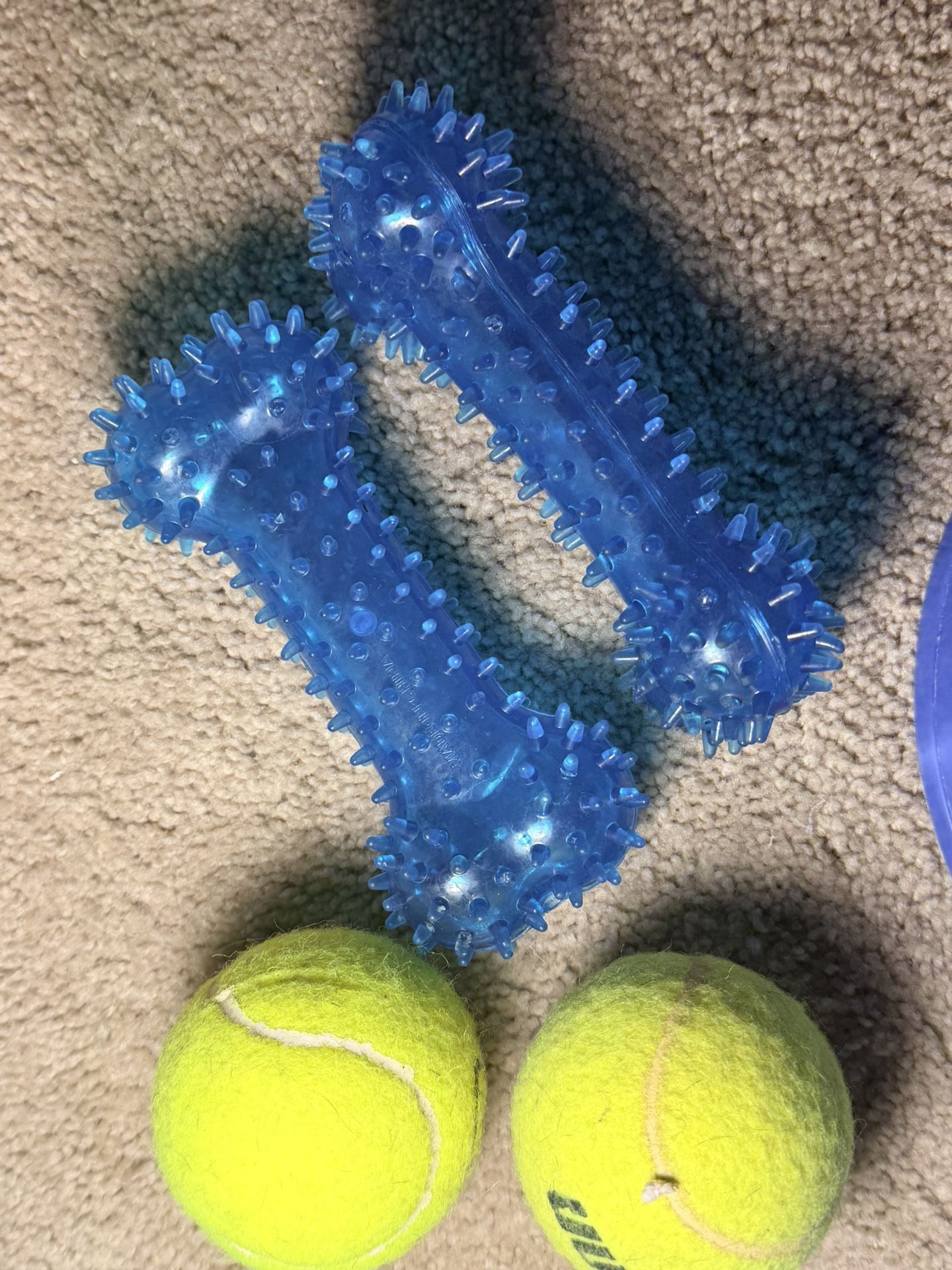 Dogs (2) massage teething, rubber, toy, bone for medium, large and extra large dogs two free tennis balls