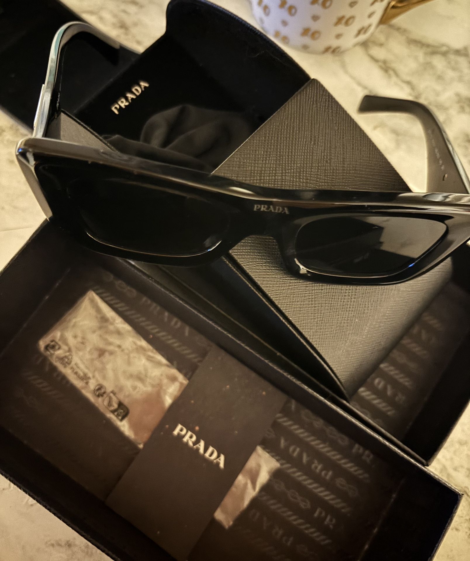 Price drop $350. Original price listed on box $517 Elevating the cat eye frame to new heights, Prada PR 13ZS is a must-have for those who seek timeless elegance. The solid dark grey lenses provide optimal protection while adding an extra touch of sophistication to this striking black frame crafted from premium acetate material. Elevated by its unique cat eye shape and effortlessly chic appeal, this style effortlessly exudes sophistication and allure that will never go out of fashion.