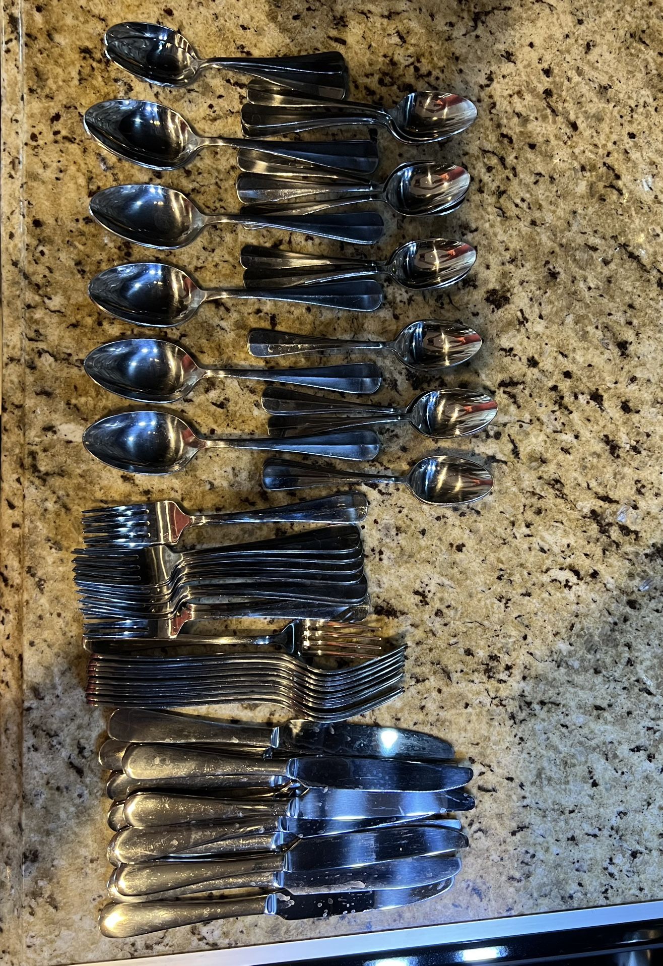 63 total pieces : Large forks - 10 Small forks - 10 Large spoons - 10 Small spoons - 22 Butter knives - 11 Wallace Stainless Steel - Dishwasher safe Dinnerware Utinsel Set-63 Pieces