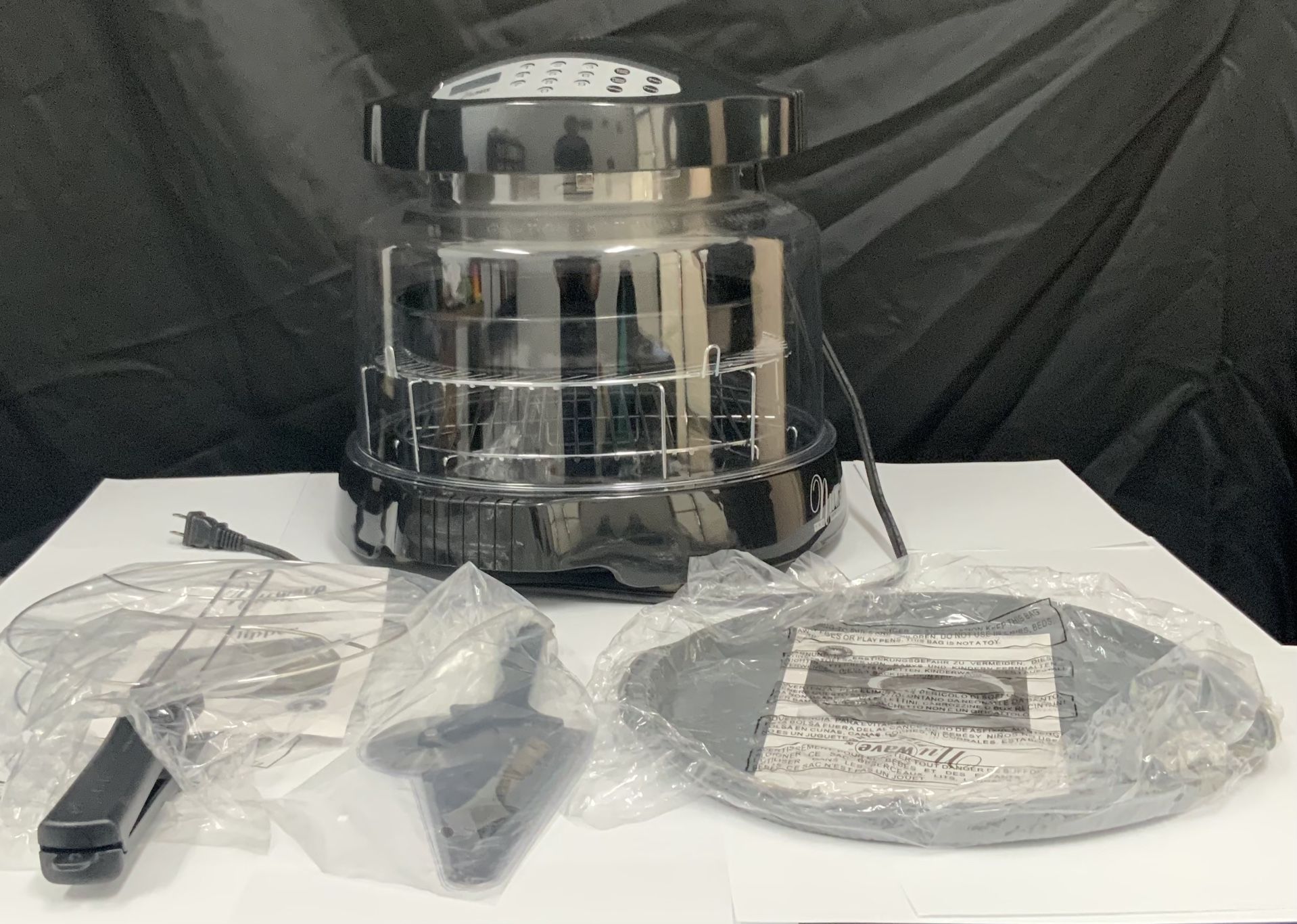 Includes a pizza flipper, a silicone pizza liner, two silver racks, a pizza cutter, a manual, booklet and DVD. The oven has been tested and works. The racks have minor stains. The pan has minor wear. The manuals, booklet and cooking instructions have creases. May consider trading for comics, video games or action figures. Pick-up in Oregon City or Molalla.