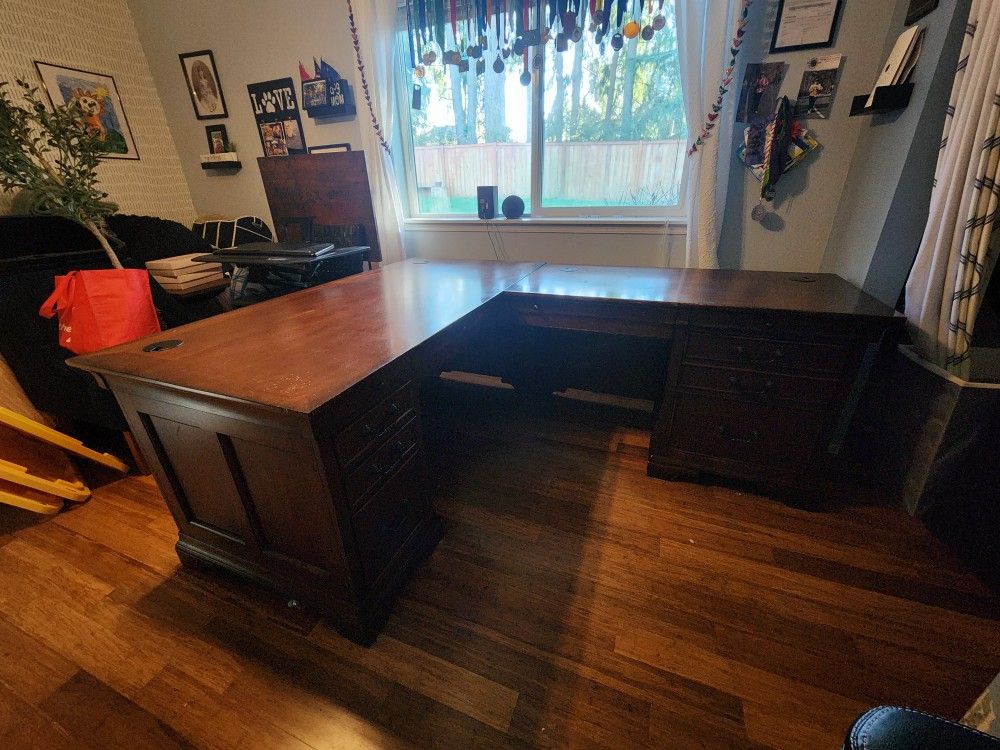 Executive desk, L-shape, nice and heavy duty, real wood. Some wear and use but still in really good shape. File drawer, divider drawers, keyboard tray, lots of storage and looks great from both front and back. Bring truck and help to load - its heavy!!!