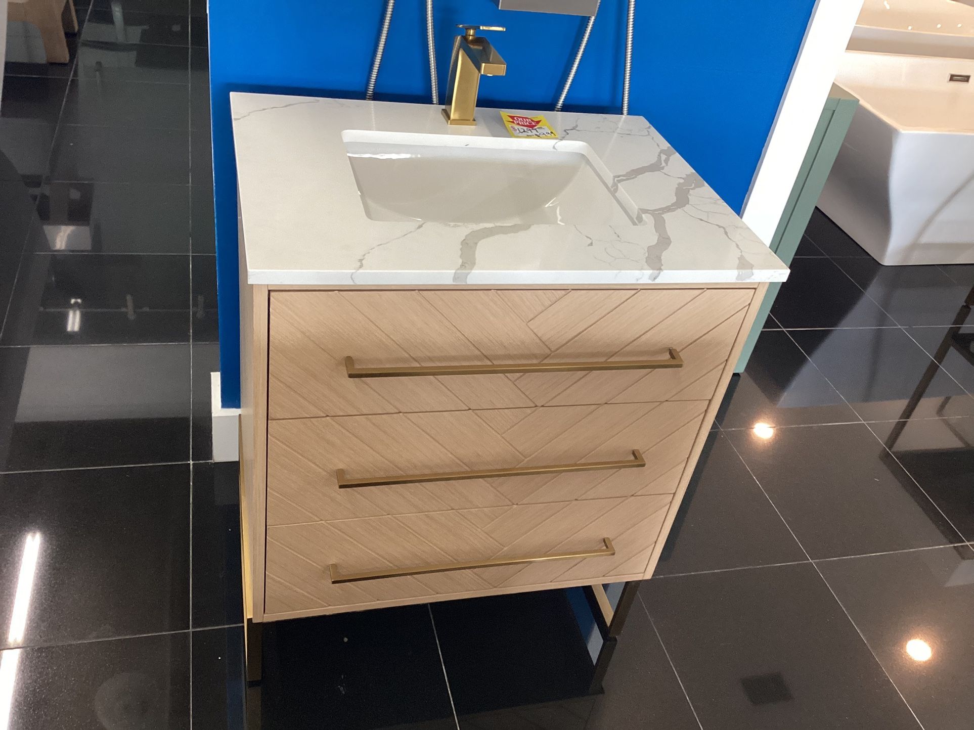 The detail on this vanity will add just the right amount of pop to your bathroom! It is 30” Wide 22” Deep 35.5” High. It’s is fully assembled and ready to be picked up today! Call us at (contact info removed)