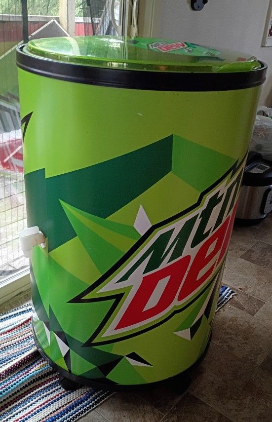 It features a bright green design with the Mountain Dew logo and branding. The cooler is insulated and designed to hold bottles or cans with ice. It is equipped with durable wheels for easy transport and a hinged flip-up lid for access. External dimensions are approximately 23″W x 37″H.