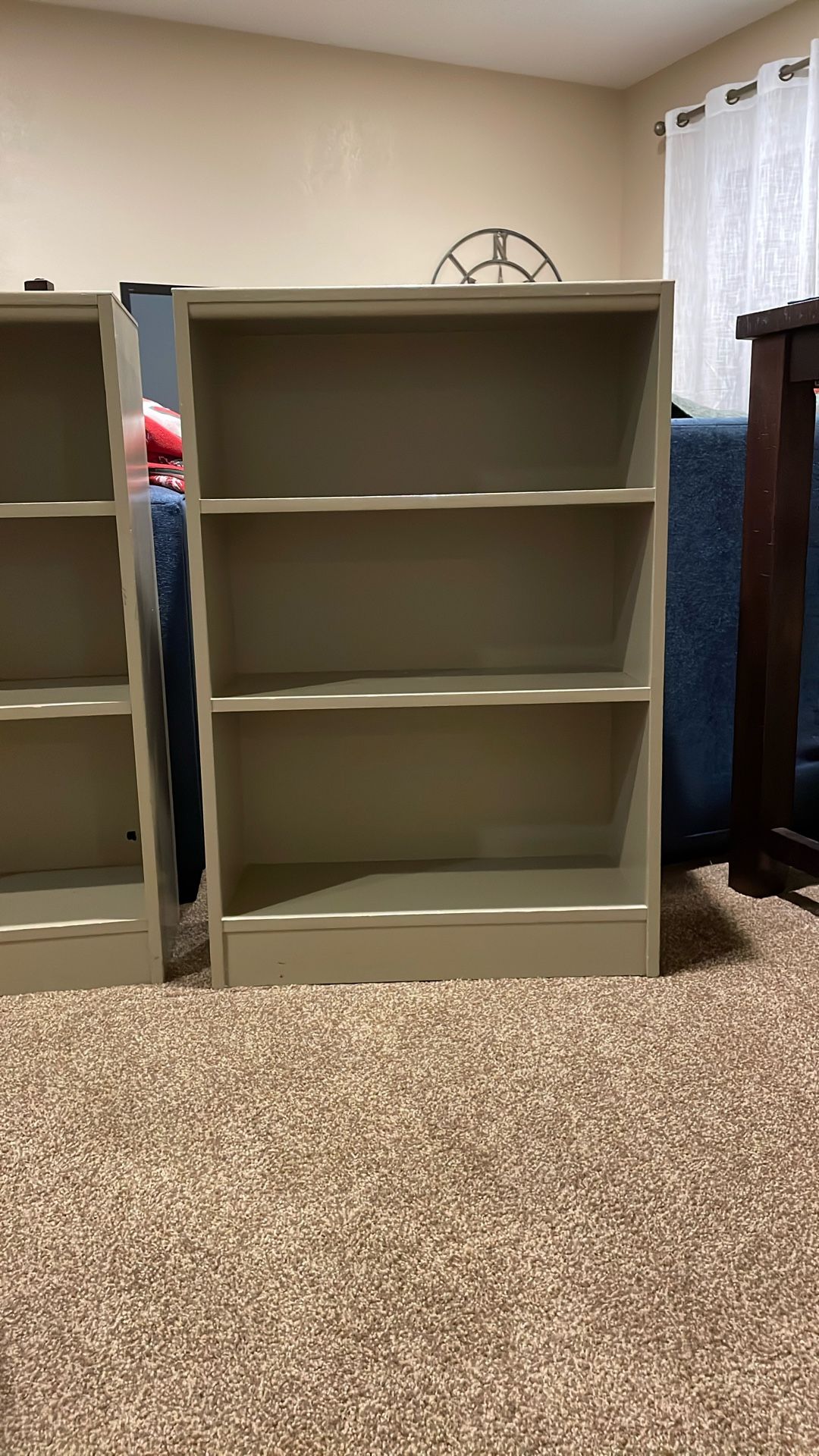 Solid wood bookcase. .Three stationary tiers. Has small hole on back side and a graze on the top, see photos. 36” x 25” x 9.5”.