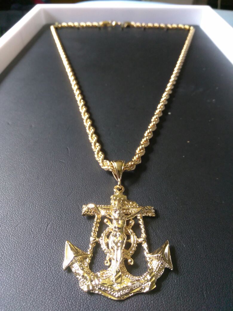 14k Gold laminated Rope chain with Anchor The chain is 26" inches long and the anchor charm is 1.5" each item has 5% gold laminated over the base metal. Gold filled jewelry last way longer than gold plated jewelry does. Let me know if you're interested I can work with you. Cadena con Ancla de oro laminado. La cadena miede 26" y la ancla miede 1.5". Cada pieza tiene 3 capas de 14 kilate Oro laminado ariba, se parece igualita a una de oro puro y no se dispinta como el oro chapiado con garantia.