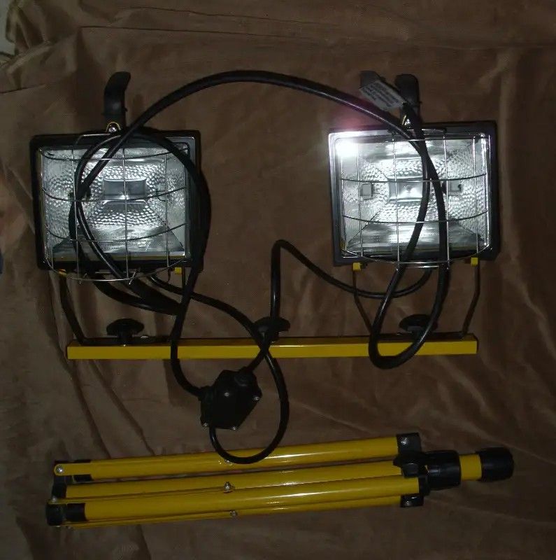 Dual halogen work lamps with tripod. One light is out but I have the bulb for it.