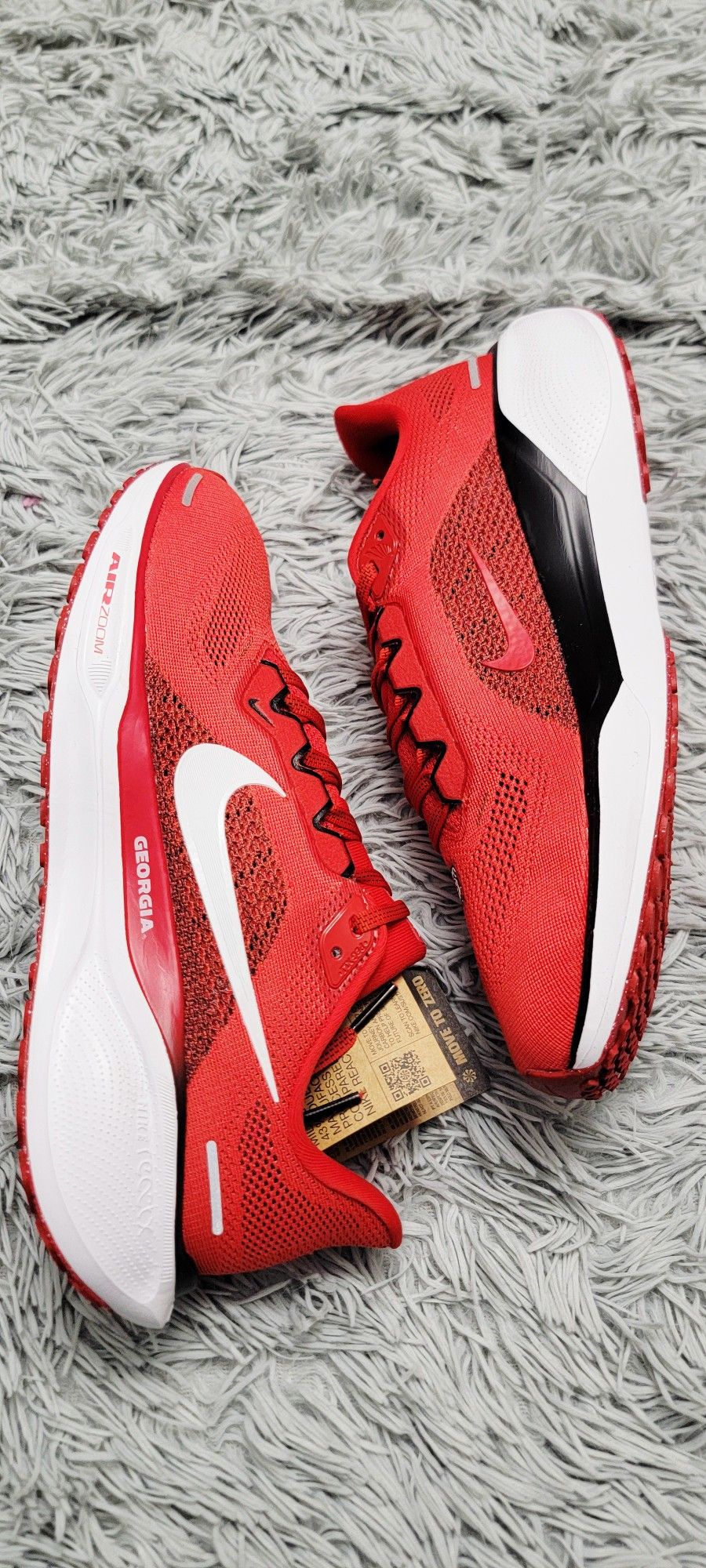Size 10 Men's Nike Air Zoom Pegasus 41 Georgia Bulldogs FZ5115-600. New without box. Same day shipping. The Size 10 Men's Nike Air Zoom Pegasus 41 Georgia Bulldogs FZ5115-600 is a stylish and comfortable sneaker designed for the modern man. Featuring a low top design, lace-up closure, and cushioned insole, this shoe provides both performance and comfort. The red color and Georgia Bulldogs theme make it a great choice for fans of the college team. With a durable rubber outsole and synthetic upper material, this shoe is suitable for various activities such as walking, school, and basketball. The Nike Air Zoom Pegasus 41 combines athleisure style with athletic functionality, making it a versatile option for everyday wear.