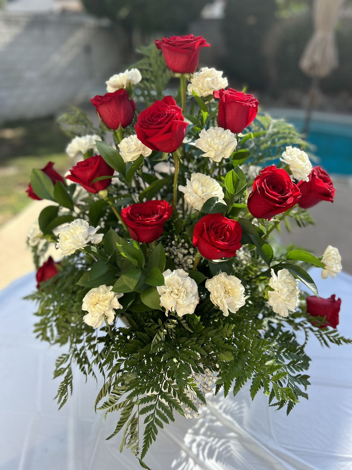 1 red rose and white carnation arrangement