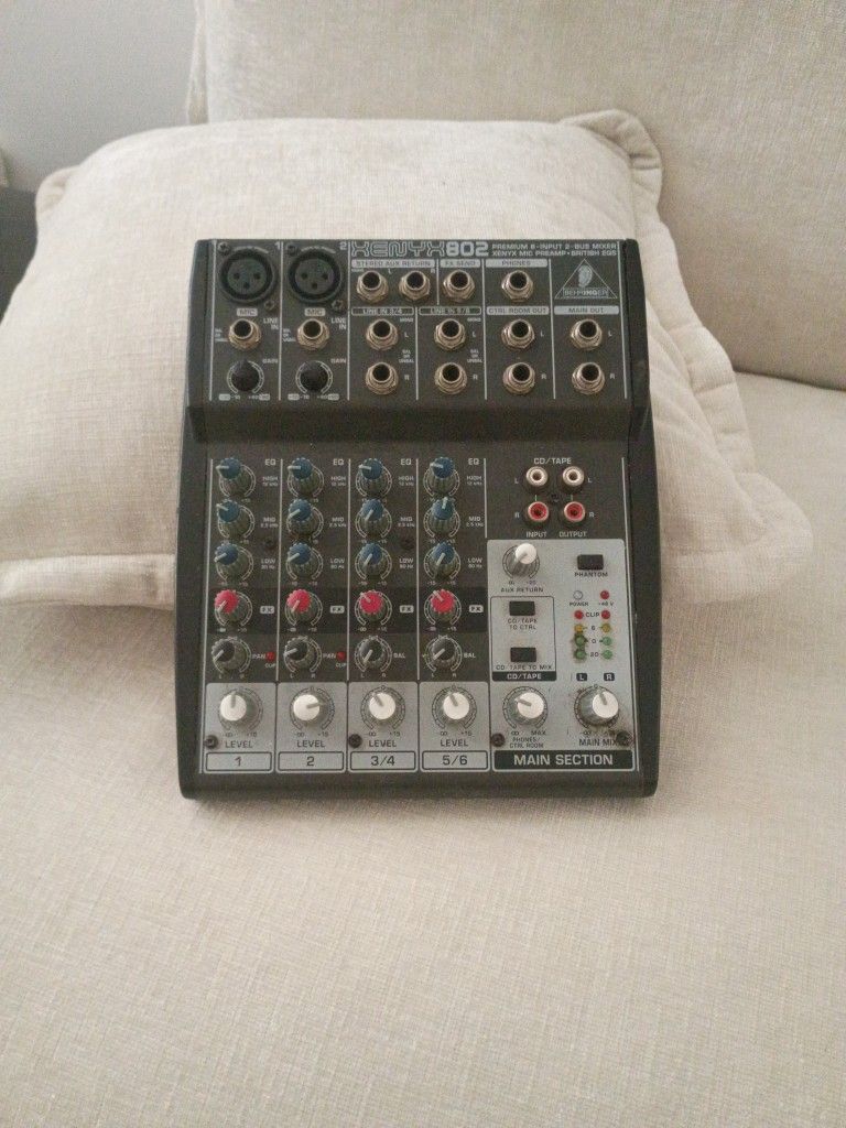 Behringer XENYX 802 8-input, 2-bus audio mixer. two studio-grade XENYX mic preamps with phantom power. includes "British" style 3-band EQs on all channels for warm, musical sound. It has a post-fader FX send control per channel for connecting external effects processors. The design is ultra-compact, making it suitable for both studio and live use.