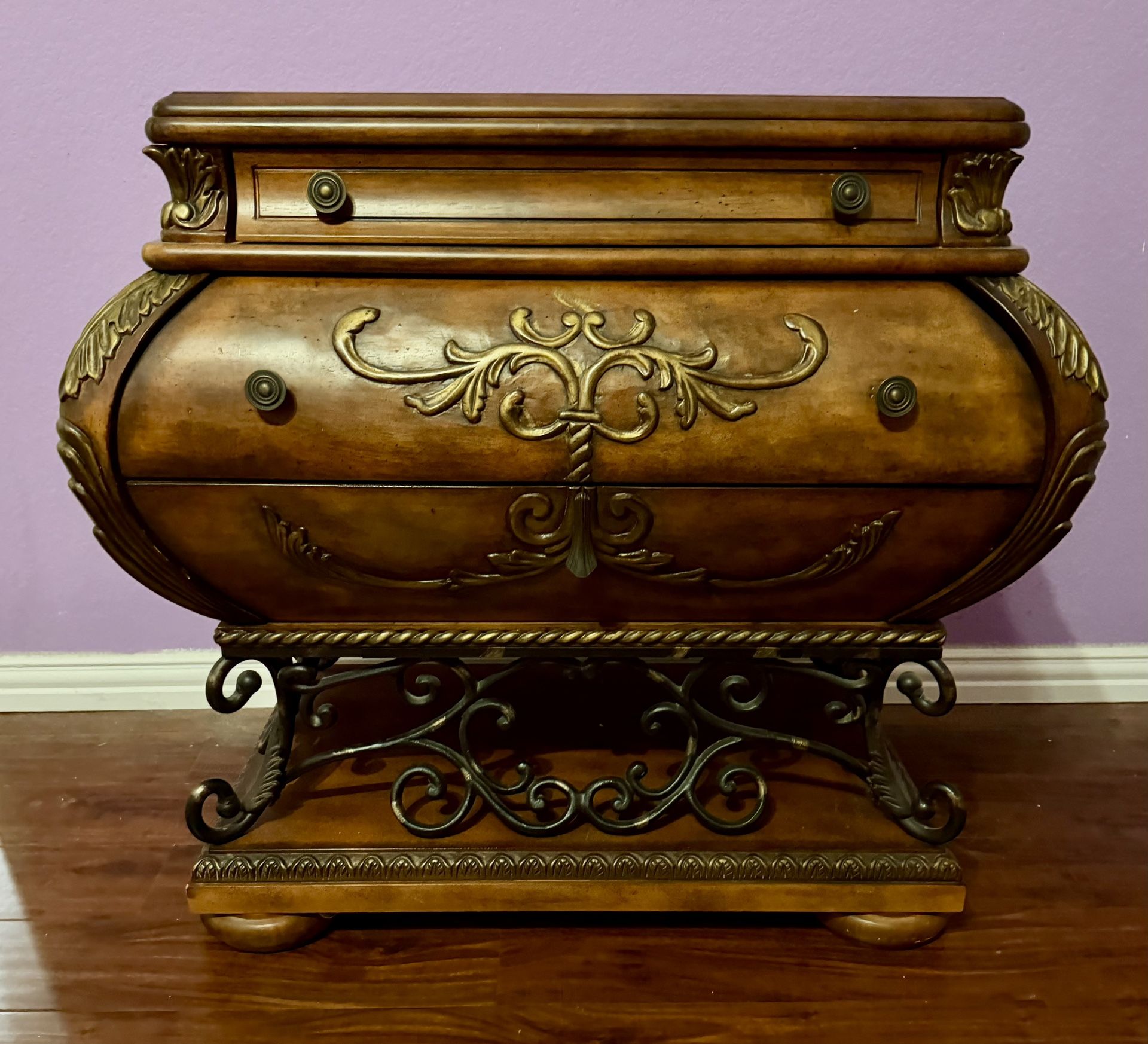 Contemporary Bombay Style 3 Drawer Cabinet, With Metal Base, 32" x 35" x 20"
