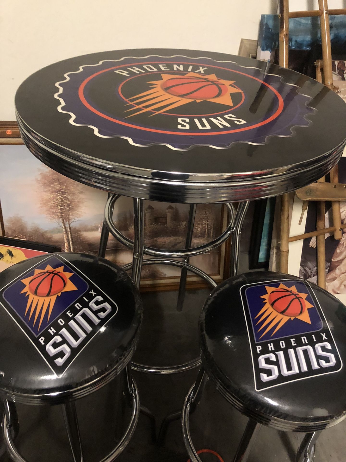 Custom made leather tables and stools, sun’s logo regularly $800