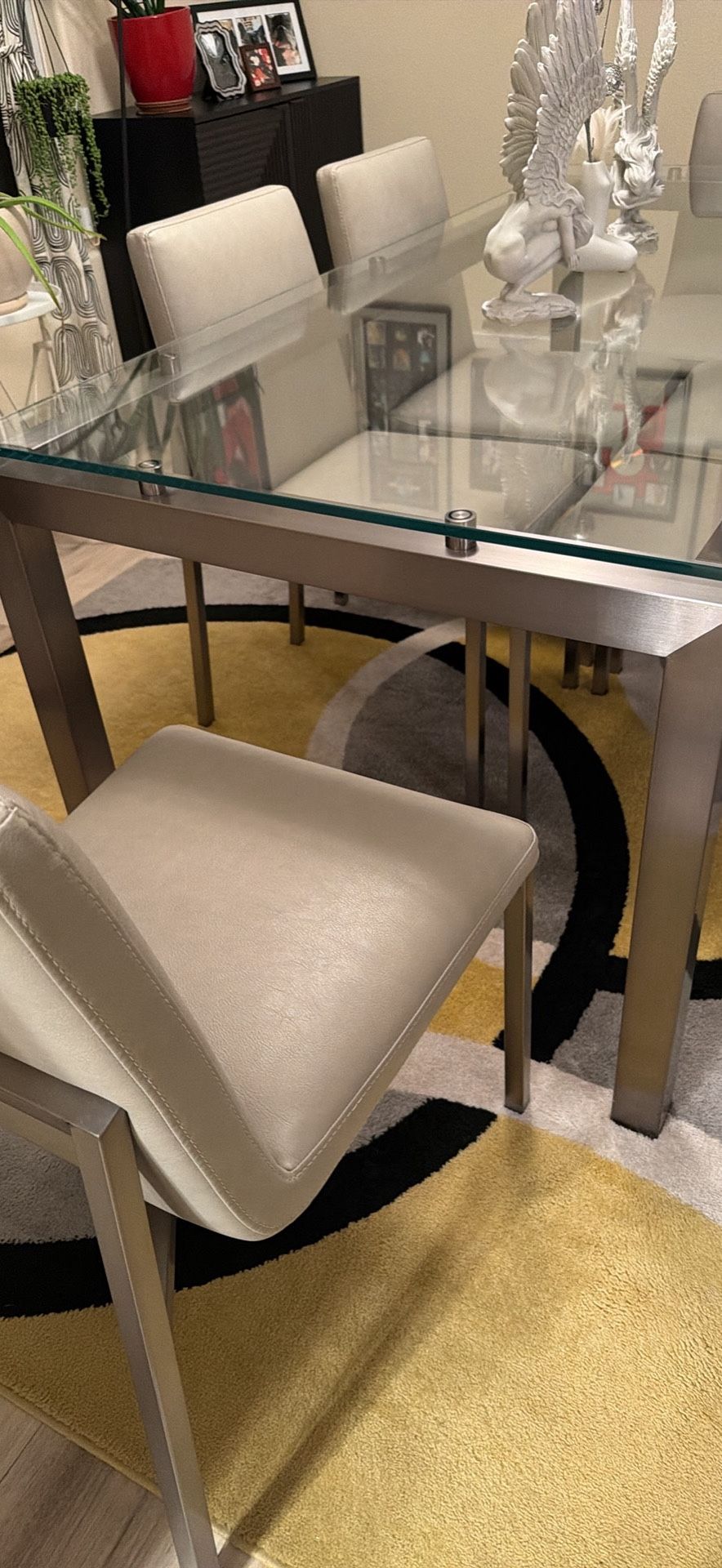 Beautiful modern dining set from Living Spaces in excellent condition! Barely used - selling due to move. What’s Included: ∙ Large glass top dining table (76”L x 36”W x 30”H) ∙ 6 upholstered dining chairs (34”H, seat depth 17”, chair depth 24”) ∙ Brushed metal/silver frame Condition: Excellent - barely used, no stains, no scratches. This set looks brand new and has been well-maintained in a smoke-free home. Style: Contemporary design with sleek glass top and cream/beige faux leather upholstered chairs. Perfect for modern or transitional spaces. Seats 6-8 people comfortably. Details: ∙ From Living Spaces (quality furniture retailer) ∙ Owned for 1 year ∙ Must see to appreciate the quality ∙ Heavy-duty construction with sturdy metal frame ∙ Easy to clean glass surface Pickup in Las Vegas. Serious inquiries only please. This is a great deal for a like-new set that retails for much more!