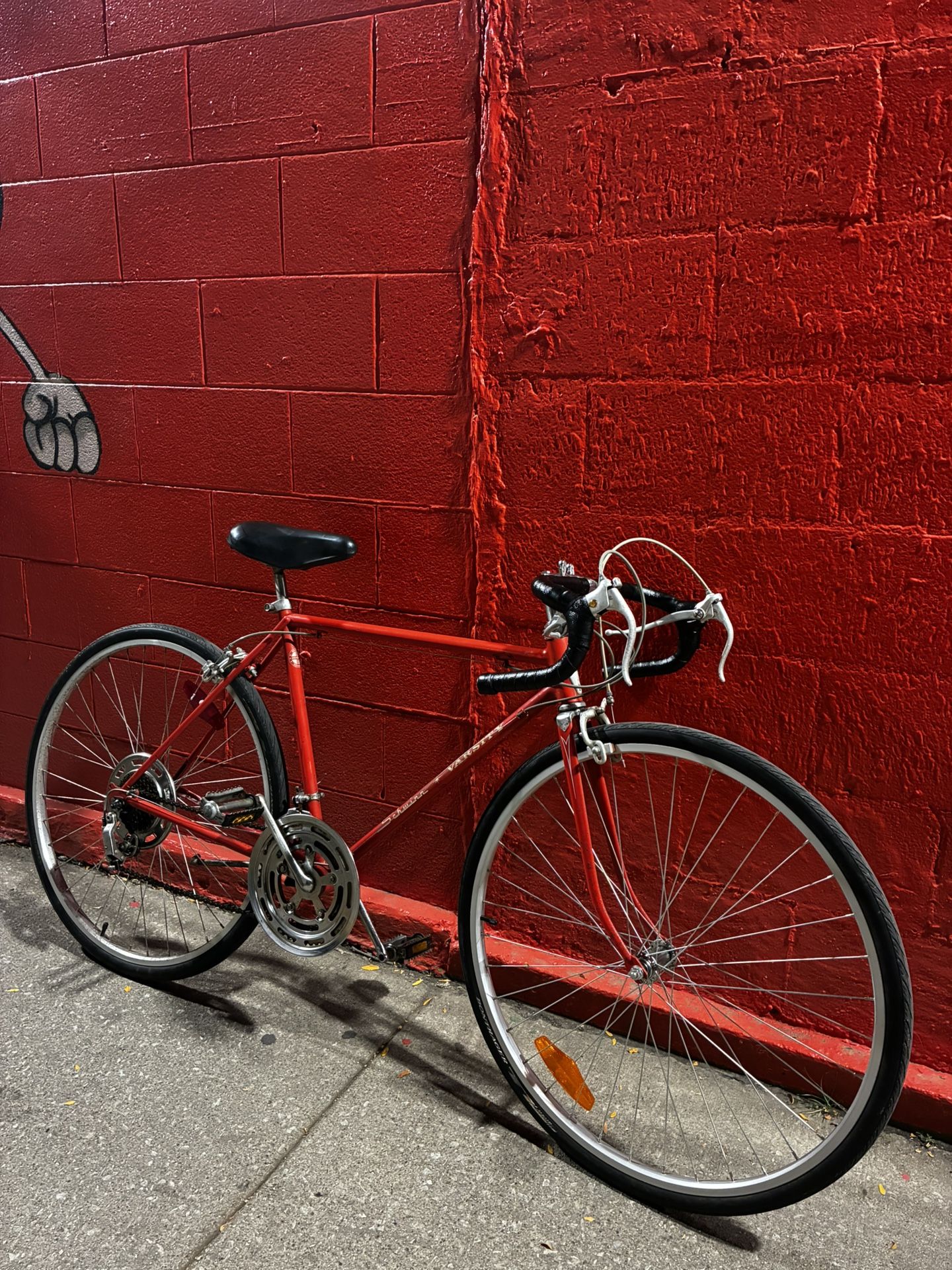 Antique vintage Red 10-speed road bike with a 21-inch steel frame, 27-inch wheels, and drop handlebars with black grip tape all good condition