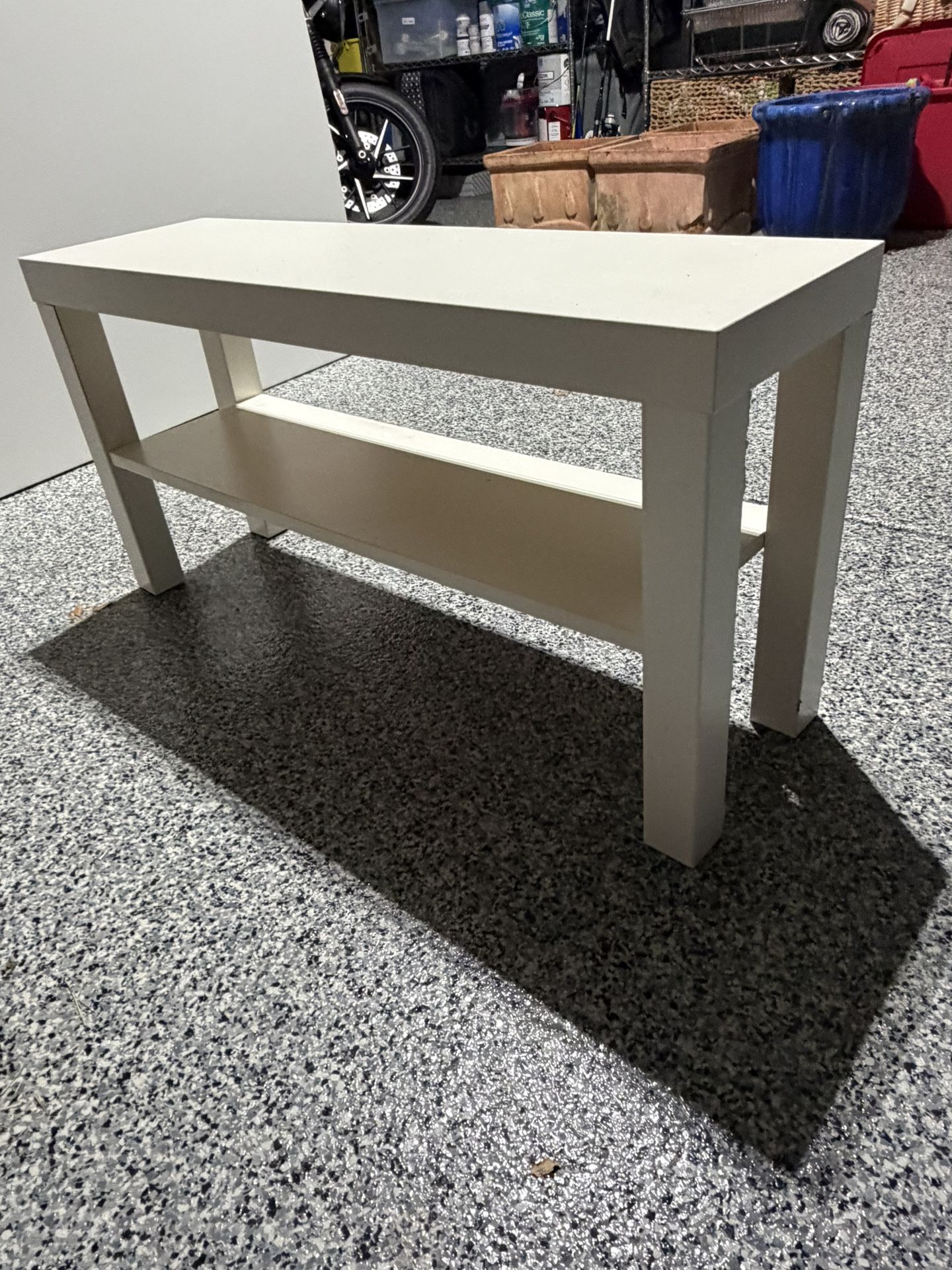 10 1/4 wide. 35.5 length. 18 high Shoe Shelf/Bench: • White wood finish • Open bottom shelf for shoes or storage • Can also be used as an entryway or end-of-bed bench