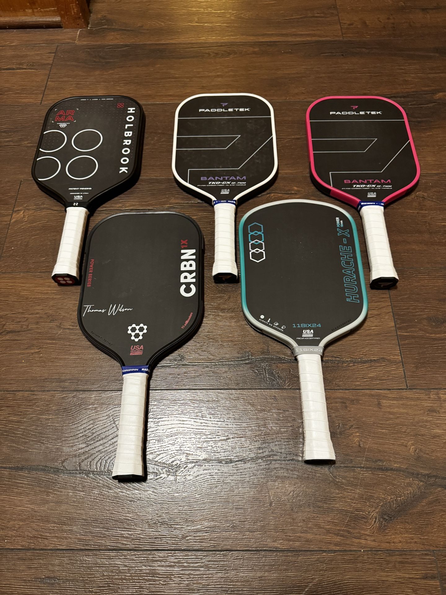 Buy 1 or Bundled Deal. Paddletek TKO-CX 12.7mm, White - $120 Paddletek TKO-CX 12.77mm, Pink - $100 11six24 X-Huarache Power 16mm - $80 Holbrook Arma T 14mm - $120 CRBN 1X 12mm - $80 OBO Willing to take $400 for all paddles. All paddles are wrapped with brand new overgrip.