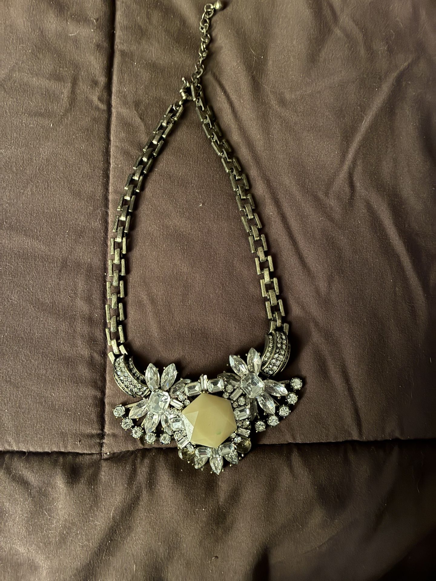Elegant J.Crew statement necklace featuring a large central neutral-tone stone accented by clear crystals. Perfect accessory for formal events or elevated everyday styling.