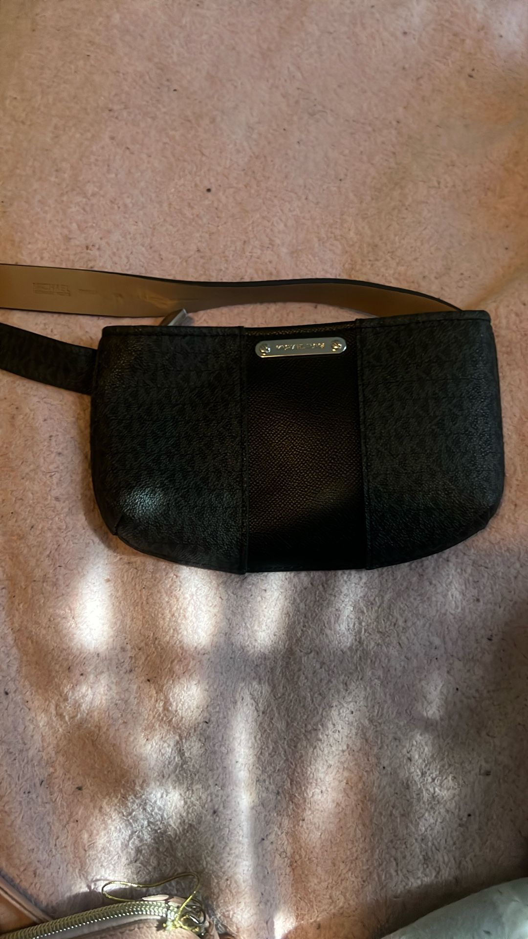 black and grey color scheme, highlighted by the iconic Michael Kors MK monogram logo on the outer panels and a contrasting smooth black faux-leather center stripe